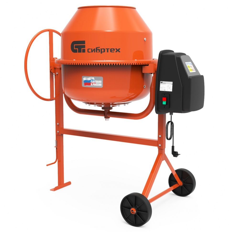 Надежный и экономичный бетоносмеситель Сибртех БСЕ-140 95477 с баком объемом 140 л и мощностью 500 Вт обеспечивает высокую скорость смешивания бетонных и строительных растворов для малых и средних объектов. Барабан сделан из стали толщиной 1,2 мм, его расширенная форма и прочные лопасти позволяют тщательно перемешать компоненты для получения однородной смеси. Вы без труда приготовите смесь для заливки фундамента, кладки кирпича, клеевой раствор для плитки или сухой цемент для строительных работ объемом до 50 л. ПреимуществаЗащита от перегрева — встроенный в обмотку тепловой выключатель останавливает двигатель при превышении допустимой температуры. Защитный кожух — пластиковый корпус закрывает работающий двигатель от повреждений и предохраняет пользователя от травм и ожогов. Влагозащита — кнопки управления закрыты от попадания воды, поэтому бетоносмеситель можно без риска поломок использовать на стройке. Высокий ресурс — чугунный венец и стальная втулка ведомого шкива выдерживают интенсивную эксплуатацию. Удобный механизм наклона — барабан легко фиксируется в нужном положении, что упрощает загрузку компонентов и подачу готовой смеси. Эргономичность — благодаря грушевидной форме барабана нагрузка на сборочный узел снижена. Ремонтопригодность — узел оси барабана сделан разъемным, поэтому подшипники можно заменить при необходимости. Прочная конструкция — стальные подкосы придают опорной стойке жесткость и обеспечивают устойчивое положение работающего бетоносмесителя. Мобильность — колеса диаметром 20,5 см позволяют легко перевозить бетоносмеситель даже на объектах со сложным рельефом местности. Разборная конструкция — барабан состоит из 2 частей, что удобно для размещения бетономешалки в зоне хранения и транспортировки.