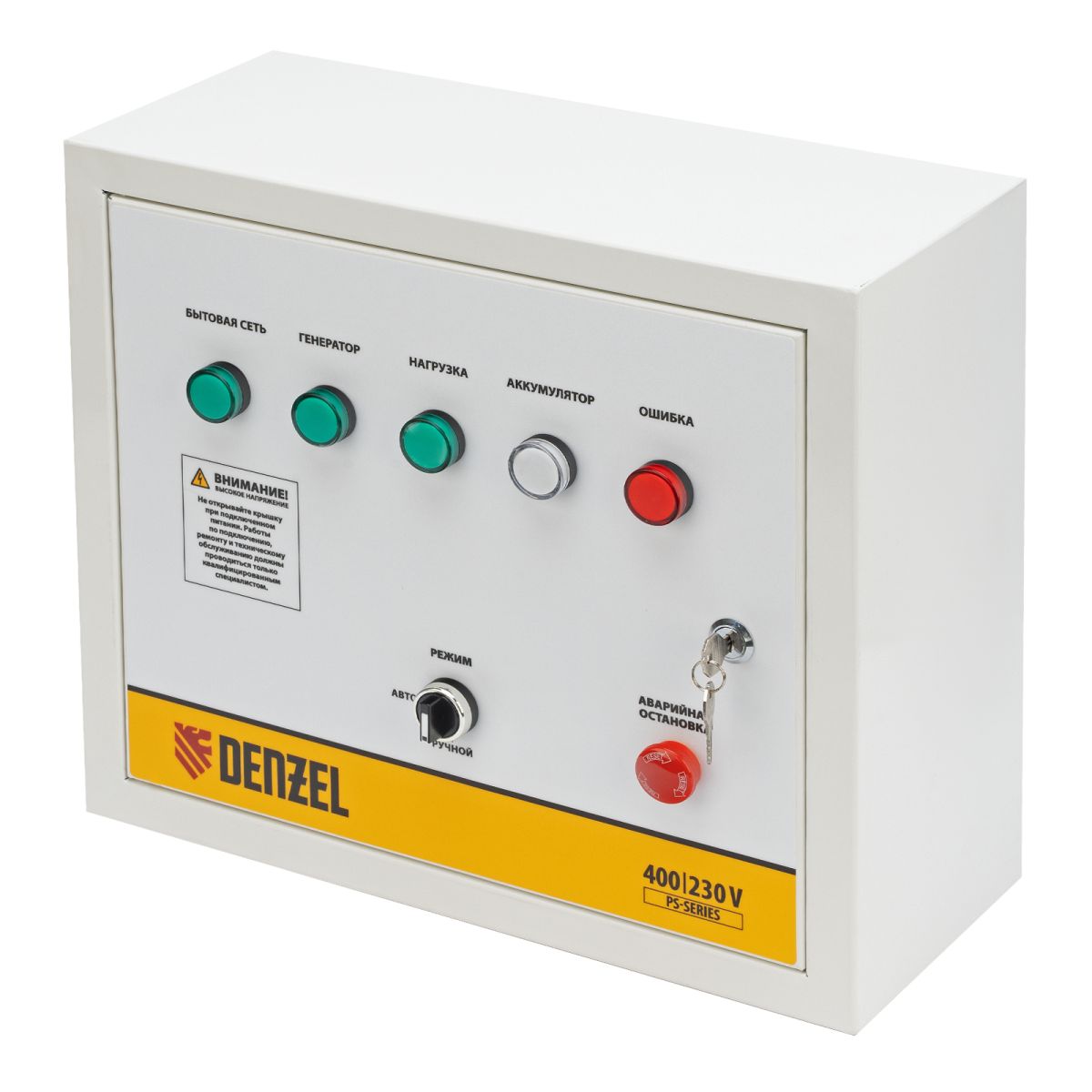 Блок автоматического запуска Denzel PS-180TS 946716 используется совместно с генератором PS-180EA или PS-180EAD-3. Позволяет создать систему автономного электроснабжения. Блок управления переключает питание на генератор при падении напряжения в стационарной сети, а при восстановлении электроснабжения останавливает генератор и переключает питание объекта обратно на сеть. Устройство рассчитано на нагрузку 20 кВА и будет полезно в загородном доме и на строительной площадке. Преимущества2 режима работы — возможен ручной или автоматический запуск генератора. Удобный контроль работы — на лицевой панели предусмотрены индикаторы напряжения сети и генератора, подключения нагрузки, а также зарядки аккумулятора и оповещения об ошибке. Безопасность — дверца блока управления закрывается на ключ для предотвращения несанкционированного доступа к электрическим выводам. Бесперебойная работа — зарядка аккумулятора происходит автоматически. Подтвержденное качество — производитель предоставляет 3-летнюю гарантию на заводской брак.