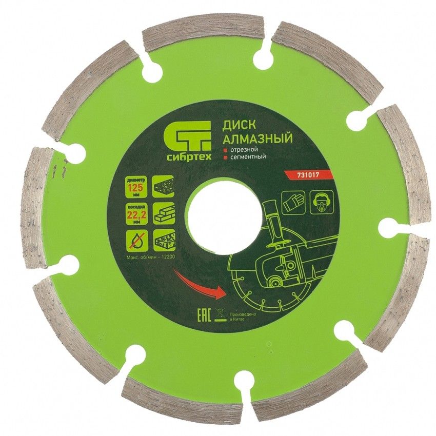 Сегментный отрезной алмазный диск Сибртех 731017 диаметром 125 х 22,2 мм применяется для сухой резки бетона, камня, шлакоблока, тротуарной плитки и кирпича. Устанавливается на углошлифовальную машину с посадочным диаметром 22,2 мм. Подходит для интенсивной работы, оптимален для решения бытовых задач. ПреимуществаЭффективное охлаждение — сегментное строение диска способствует активному отведению тепла и пыли, поэтому подача воды не требуется. Высокое качество и скорость работы — режущая кромка имеет ширину 7 мм. Износостойкость — рабочий слой нанесен методом холодного прессования. .
