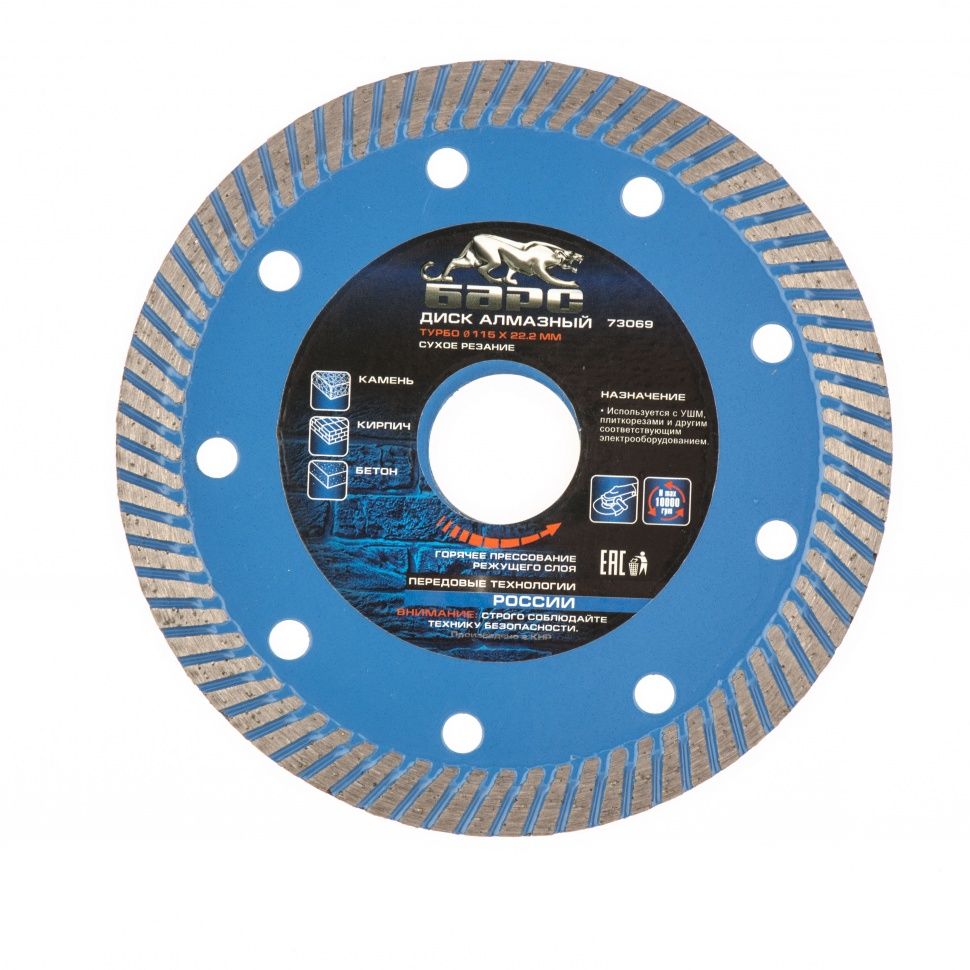 Алмазный диск Барс Турбо 73069 диаметром 115 х 22,2 мм предназначен для сухого резания бетона, в т. ч. свежего, среднеармированного железобетона, камня, кирпича, гранита и песчаника. Совместим с УШМ с посадочным диаметром 22,2 мм, используется для проведения строительных и ремонтных работ. ПреимуществаВысокая производительность — диск с режущим слоем шириной 10 мм, содержащим большое количество алмазов, подходит для профессионального использования. Быстрая резка без подачи воды — турбированная форма и перфорация обеспечивают эффективное охлаждение. Увеличенный ресурс — оптимально подобранная металлическая связка обеспечивает равномерное изнашивание алмазов и своевременное обновление режущего слоя. Высокий показатель прочности — корпус из стали 65Mn с режущим слоем, изготовленным по технологии горячего прессования, выдерживает интенсивные нагрузки. Защита от разрушения — корпус окрашен для предотвращения коррозии.