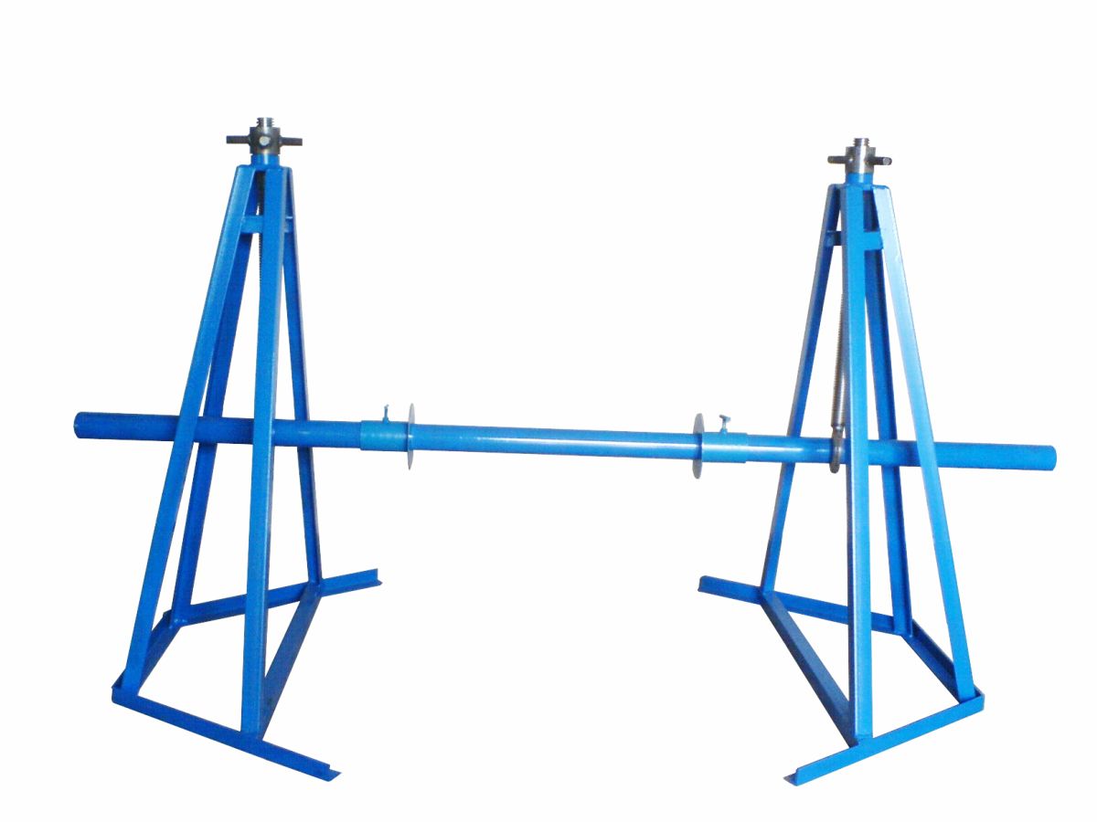 Домкрат кабельный винтовой предназначен для подъема кабельных барабанов и удержания на весу во время размотки кабеля В кабельном домкрате реализован принцип винт-гайка Вращая с помощью ручки гайку, винт производит подъем барабана В комплект входит две стойки с вышеуказанными парами, которые устанавливаются по бокам кабельного барабана, ось барабана цельнометаллическая оснащенная прижимными башмаками Прижимные башмаки рекомендуется использовать каждый раз для фиксации кабельного барабана, особенно при размотке кабеля при помощи кабестановой лебедки Поочередно вращая гайки, происходит подъем барабана.