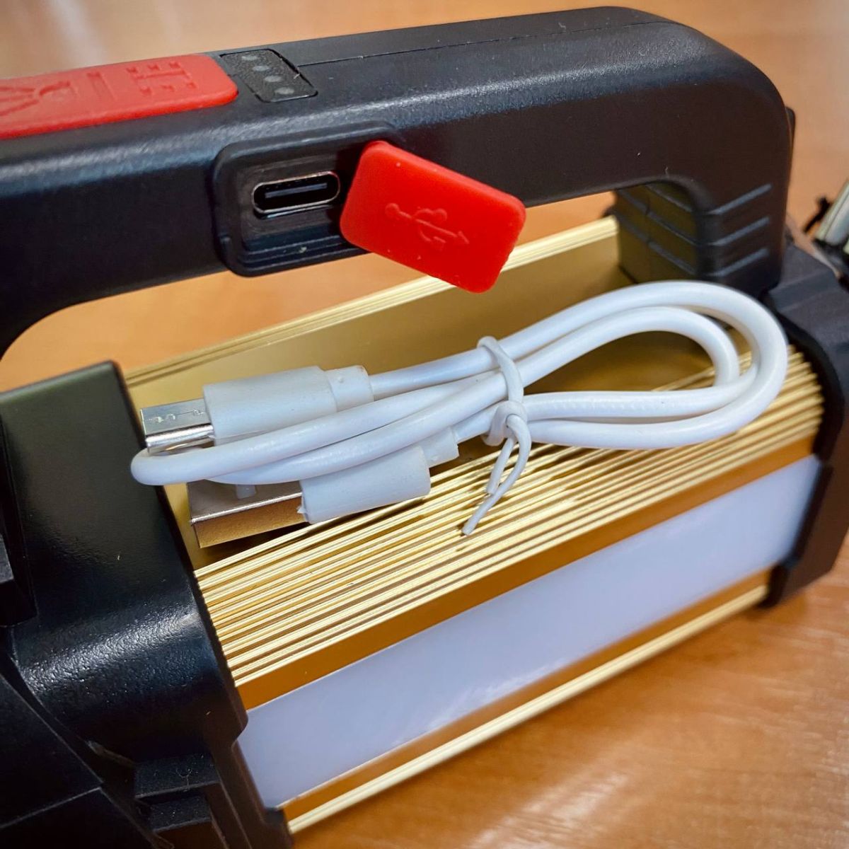 Кемпинговый фонарь-прожектор. Имеет 5 режимов работы. Оснащён 3 COB-панелями с цветовой температурой 6000К. Время работы составляет 6-8 часов в основном режиме и 10 часов в режиме кемпинговой лампы. Прочный, но легкий корпус защищает от повреждений при падениях. Все резьбовые соединения уплотнены резиновыми прокладками, что делает фонарик влагозащищенным и пыленепроницаемым. Фонарь оснащён солнечной батареей и USB-разъёмом для зарядки.