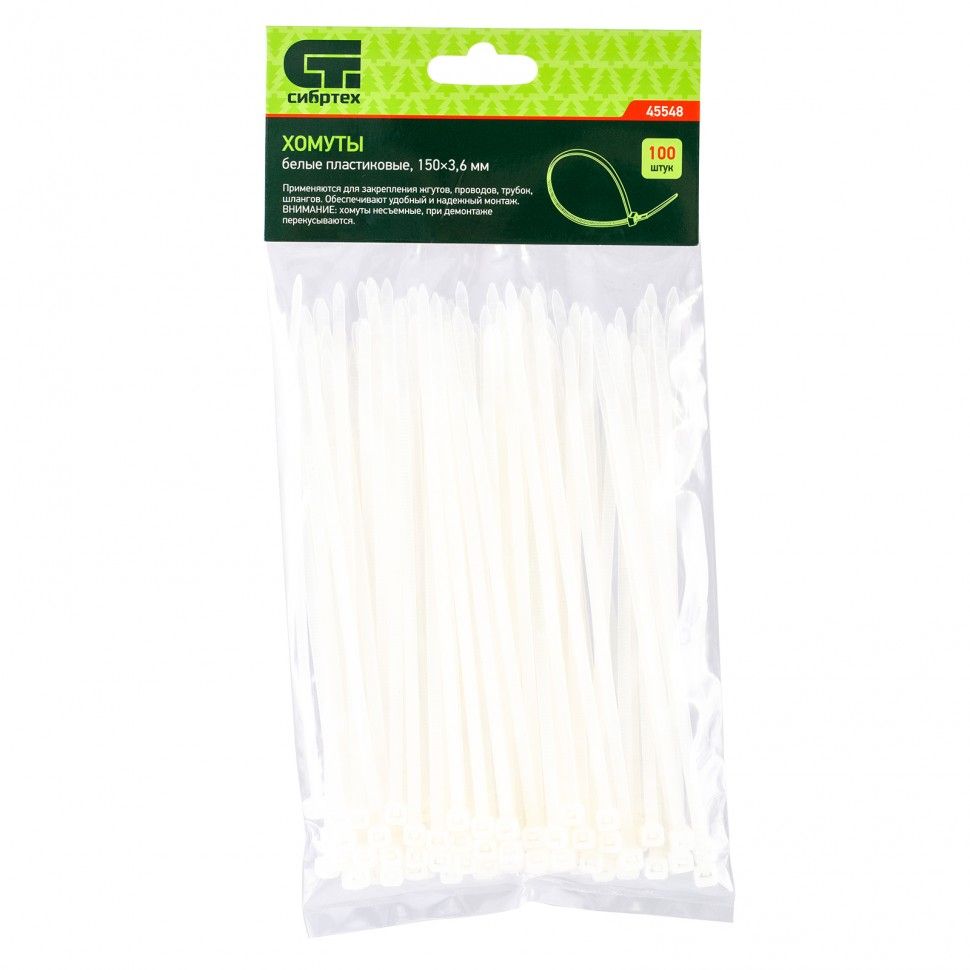 Белые пластиковые хомуты Сибртех 45548, 150 х 3,6 мм, 100 шт. в упаковке, используются для стяжки кабелей, закрепления трубок, шлангов, рекламных конструкций, а также для упаковки различных предметов. Пригодятся во время прокладки электрических и локальных вычислительных сетей, ремонта компьютерной техники, оформлении торговых стендов, комплектовании товара, будут также полезны дома, на даче и в гараже. ПреимуществаНадежные соединения — кабельные стяжки изготовлены из прочного нейлона. Возможность проведения наружных работ — хомуты устойчивы к ультрафиолету и сохраняют свои свойства при температуре от -35 до +85 ℃. 100 штук в упаковке — набора хватит надолго.