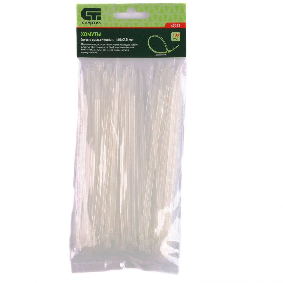 Белые пластиковые хомуты Сибртех 45523, 160 х 2,5 мм, 100 шт. в упаковке, используются для стяжки кабелей, закрепления трубок, шлангов, рекламных конструкций, а также для упаковки различных предметов. Пригодятся во время прокладки электрических и локальных вычислительных сетей, ремонта компьютерной техники, оформлении торговых стендов, комплектовании товара, будут также полезны дома, на даче и в гараже. ПреимуществаНадежные соединения — кабельные стяжки изготовлены из прочного нейлона. Возможность проведения наружных работ — хомуты устойчивы к ультрафиолету и сохраняют свои свойства при температуре от -35 до +85 ℃. 100 штук в упаковке — набора хватит надолго.