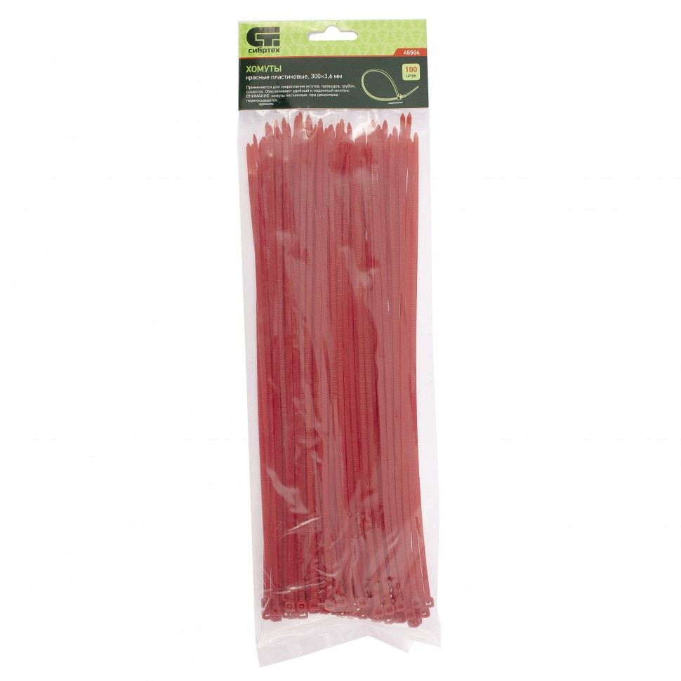 Красные пластиковые хомуты Сибртех 45504, 300 х 3,6 мм, 100 шт. в упаковке, используются для стяжки кабелей, закрепления трубок, шлангов, рекламных конструкций, а также для упаковки различных предметов. Пригодятся во время прокладки электрических и локальных вычислительных сетей, ремонта компьютерной техники, оформлении торговых стендов, комплектовании товара, будут также полезны дома, на даче и в гараже. ПреимуществаНадежные соединения — кабельные стяжки изготовлены из прочного нейлона. Возможность проведения наружных работ — хомуты устойчивы к ультрафиолету и сохраняют свои свойства при температуре от -35 до +85 ℃. 100 штук в упаковке — набора хватит надолго.