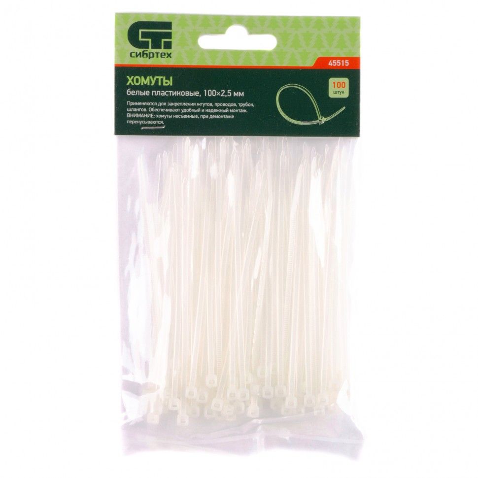 Белые пластиковые хомуты Сибртех 45515, 100 х 2,5 мм, 100 шт. в упаковке, используются для стяжки кабелей, закрепления трубок, шлангов, рекламных конструкций, а также для упаковки различных предметов. Пригодятся во время прокладки электрических и локальных вычислительных сетей, ремонта компьютерной техники, оформлении торговых стендов, комплектовании товара, будут также полезны дома, на даче и в гараже. ПреимуществаНадежные соединения — кабельные стяжки изготовлены из прочного нейлона. Возможность проведения наружных работ — хомуты устойчивы к ультрафиолету и сохраняют свои свойства при температуре от -35 до +85 ℃. 100 штук в упаковке — набора хватит надолго.