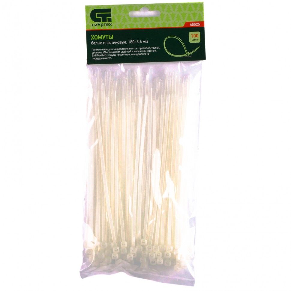 Белые пластиковые хомуты Сибртех 45525, 180 х 3,6 мм, 100 шт. в упаковке, используются для стяжки кабелей, закрепления трубок, шлангов, рекламных конструкций, а также для упаковки различных предметов. Пригодятся во время прокладки электрических и локальных вычислительных сетей, ремонта компьютерной техники, оформлении торговых стендов, комплектовании товара, будут также полезны дома, на даче и в гараже. ПреимуществаНадежные соединения — кабельные стяжки изготовлены из прочного нейлона. Возможность проведения наружных работ — хомуты устойчивы к ультрафиолету и сохраняют свои свойства при температуре от -35 до +85 ℃. 100 штук в упаковке — набора хватит надолго.
