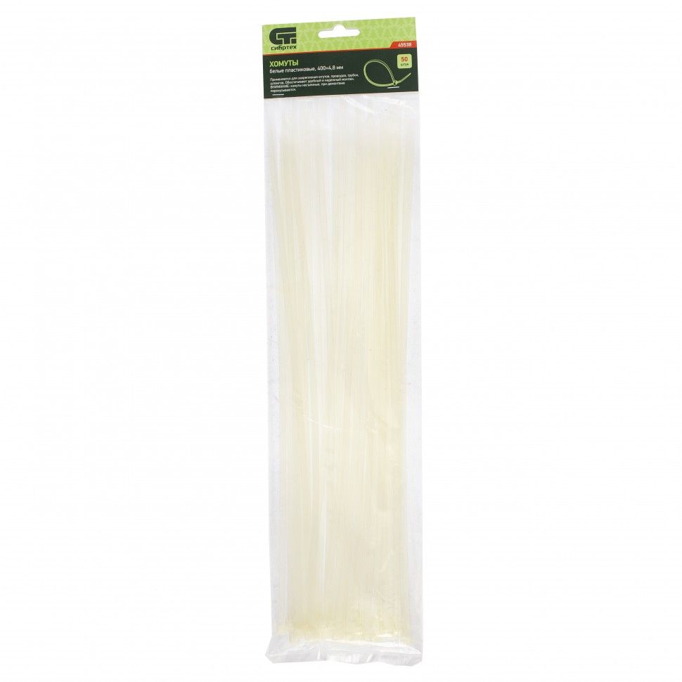 Белые пластиковые хомуты Сибртех 45538, 400 х 4,8 мм, 50 шт. в упаковке, используются для стяжки кабелей, закрепления трубок, шлангов, рекламных конструкций, а также для упаковки различных предметов. Пригодятся во время прокладки электрических и локальных вычислительных сетей, ремонта компьютерной техники, оформлении торговых стендов, комплектовании товара, будут также полезны дома, на даче и в гараже. ПреимуществаНадежные соединения — кабельные стяжки изготовлены из прочного нейлона. Возможность проведения наружных работ — хомуты устойчивы к ультрафиолету и сохраняют свои свойства при температуре от -35 до +85 ℃. 50 штук в упаковке — набора хватит надолго.