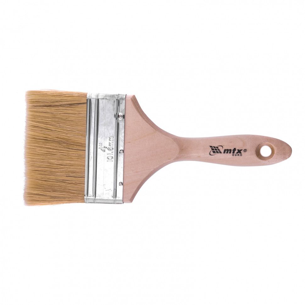 Плоская кисть MTX «Евро» 83057 шириной 4 дюйма, с натуральной щетиной и деревянной ручкой, используется для профессионального окрашивания поверхностей. Рекомендуется для нанесения агрессивных ЛКМ с содержанием растворителей. ПреимуществаШирина рабочей части 100 мм — кистью удобно окрашивать участки большой площади. Прочность и долговечность — бандаж надежно скрепляет щетину с рукояткой, поэтому кисть выдерживает многократное использование. Высокое качество окрашивания — дважды вываренная щетина не содержит посторонних примесей, а расщепленные кончики увеличивают ее способность впитывать и отдавать краску. Коррозионная стойкость — защитное покрытие предотвращает разрушение бандажа под воздействием влаги. Эргономичность — отшлифованная и покрытая лаком рукоятка удобно лежит в руке, а специальное отверстие позволяет подвешивать кисть на гвоздь или крючок.