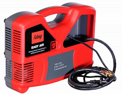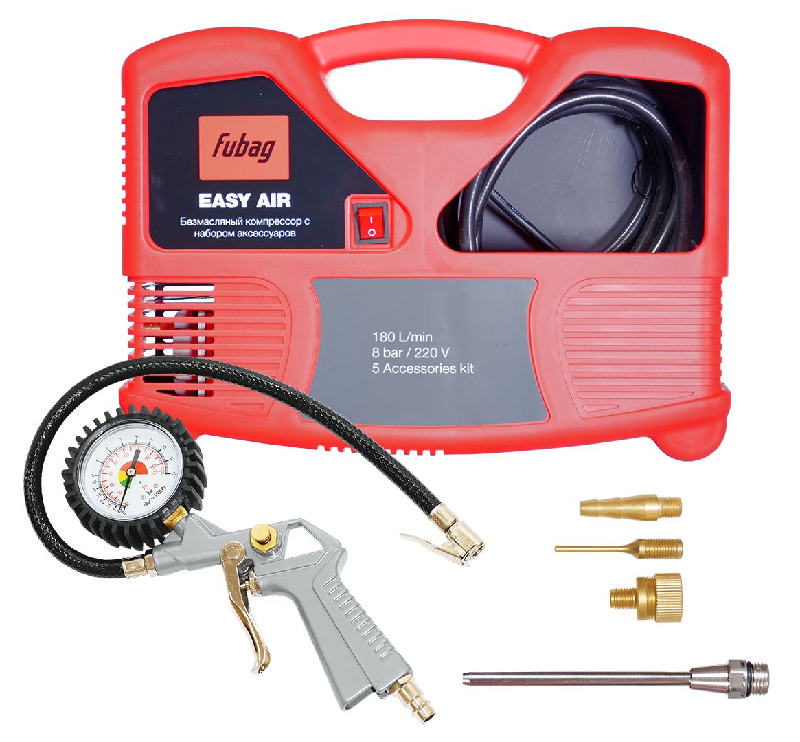 Fubag Easy Air - переносной безмасляный компрессор, предназначенный для обеспечения пневмоинструмента чистым сжатым воздухом. Широко применяется в ремонте и домашнем применении. В корпусе компрессора Easy Air Fubag есть отсек для хранения пневмоинструмента. Крышка внутренней поверхности оборудована специальными кронштейнами для размещения всех необходимых насадок. Благодаря компактным размерам, небольшому весу и ручке для переноски набор компрессорного оборудования легок в транспортировке и хранении. В комплект с компрессором Fubag Easy Air входит: воздушный шланг (3 м), пистолет для накачки шин, насадка для надувки мячей, насадка для накачки матрасов, насадка для накачки велосипедных шин.
