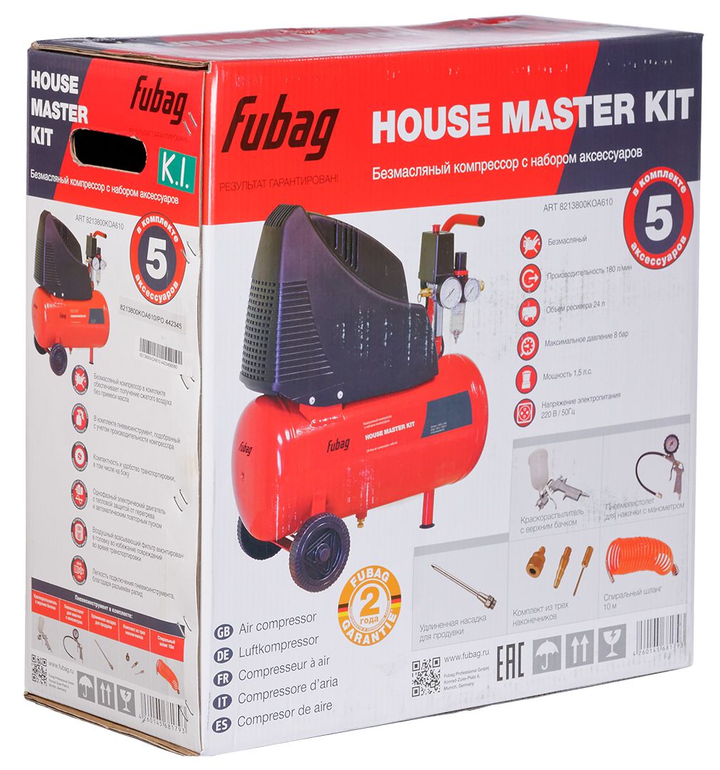 FUBAG HOUSE MASTER KIT + 5 предметов (OL 195/24 + 5 предметов) - безмасляный компрессор, необходимый для нагнетания сжатого воздуха в различный пневмоинструмент. Набор предназначен для проведения работ по дому, обслуживанию автомобилей и других нужд. Компактный компрессор с небольшим ресивером 24 л и производительностью 180 л/мин отлично подходит для различных работ по дому, на даче и в гараже. Набор компрессорного оборудования без проблем запускается при низких температурах. Компрессорный набор FUBAG HOUSE MASTER KIT уверенно работает на неровных поверхностях. Полностью металлическая конструкция защищена от возникновения коррозии. Благодаря небольшому весу, комплекту колес и ручке, компрессор легок в транспортировке. В комплект с компрессором входит: краскораспылитель с верхним бачком объемом 0.5 л, пистолет для накачки шин с манометром, комплект из трех наконечников, насадка для продувки, гибкий спиральный шланг длиной 5 м с быстроразъемными соединениями.