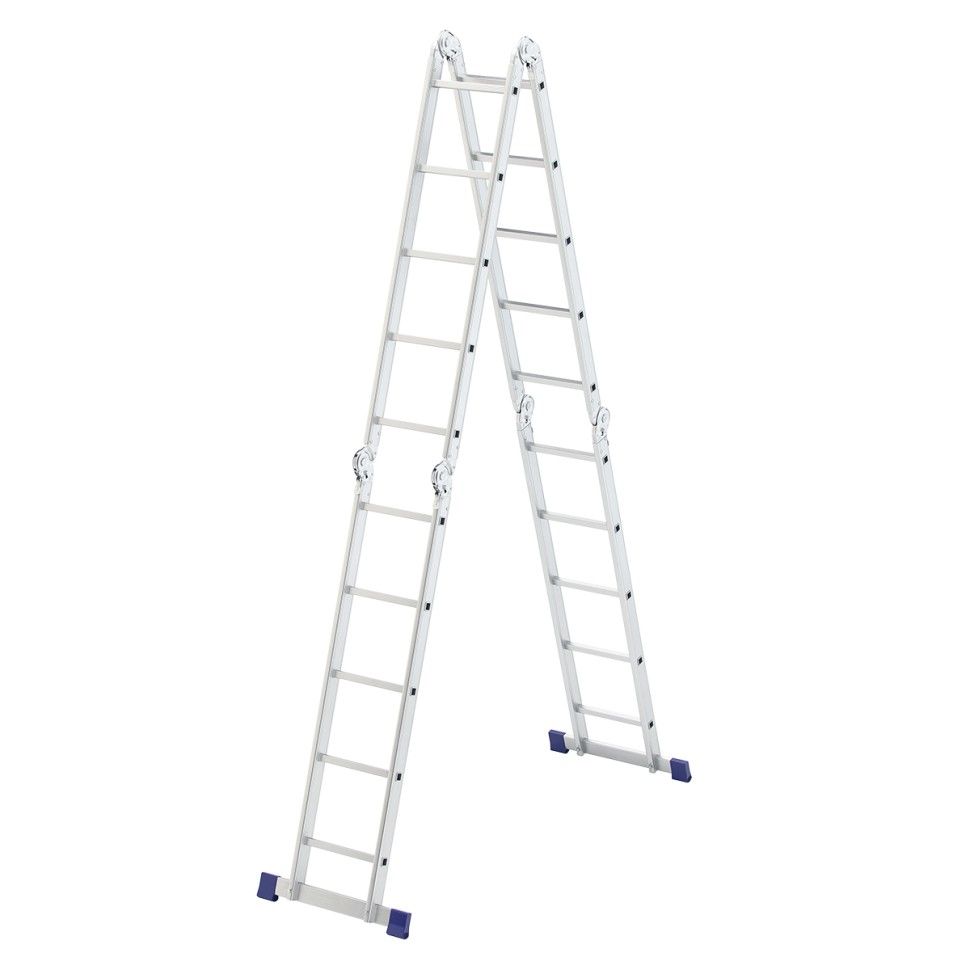 Шарнирная алюминиевая лестница Сибртех 97883 представляет собой 4 секции по 5 ступеней, которые можно настроить в нескольких рабочих положениях. Она может использоваться в качестве приставной лестницы, двухсторонней стремянки и помоста. Будет полезна как в быту, так и на небольших стройках, в гараже и магазинах. ПреимуществаШирокие траверсы — лестница устойчиво фиксируется на горизонтальной поверхности в любом рабочем положении. Противоскользящее рифление на ступенях — пользоваться лестницей безопасно, нога не соскользнет в процессе выполнения работ. Сочетание легкости и прочности — рама изготовлена из прессованного алюминиевого профиля прямоугольного сечения, выдерживает нагрузку до 120 кг. Надежные шарнирные механизмы — лестница не шатается в рабочих положениях, смена рабочих положений происходит быстро и легко.