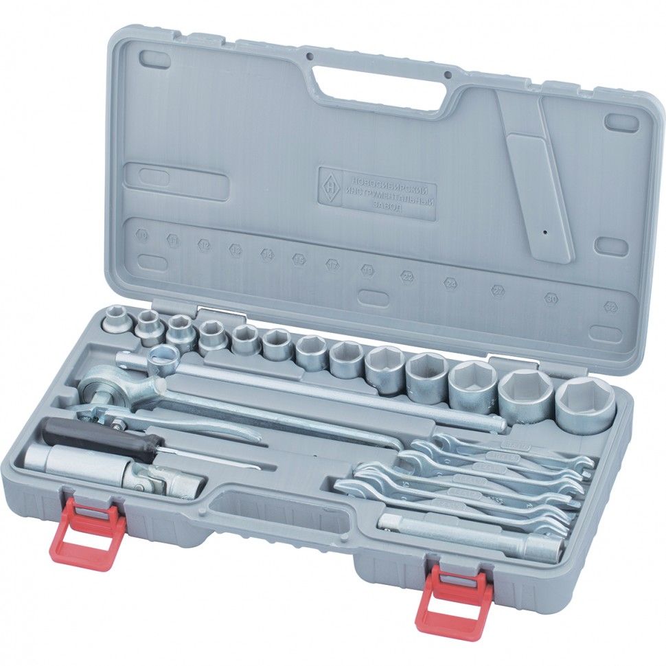 Набор «Автомобилист» НИЗ 13452 в пластиковом боксе предназначен для технического обслуживания машин и будет полезен автовладельцам. Его можно взять с собой в дорогу или использовать в гараже. Набор включает все необходимое для срочного ремонта: плоскогубцы, головку свечную 21 мм, отвертку, удлинитель для работы в труднодоступных местах, рожковые ключи, торцевые головки, шарнир и трещотку. ПреимуществаПрочность и высокий ресурс — элементы набора изготовлены из инструментальной стали 40Х, устойчивой к динамическим нагрузкам. Защита от коррозии — инструменты оцинкованы, поэтому не разрушаются под воздействием влаги. Универсальность — в комплект входит 13 торцевых головок на 10, 11, 12, 13, 14, 15, 17, 19, 22, 24, 27, 30 и 32мм. Быстрый монтаж и демонтаж резьбовых соединений с шестигранной головкой — в наборе 6 двусторонних гаечных ключей с открытым зевом типоразмера 8х10, 10х12, 12х14, 13х15, 14х17, 17х19. Комбинированная отвертка — можно работать с крепежными элементами типоразмера SL 6 и PH 3. Работа в труднодоступных местах — в комплект включены шарнир карданный и удлинитель 125 мм, а также небольшие плоскогубцы для надежного захвата и удерживания мелких деталей. Продуманная конструкция свечной головки — можно легко и безопасно установить или демонтировать свечу зажигания. Быстрый переход от монтажа к демонтажу — трещоточный ключ оснащен переключателем реверса. Удобное хранение и транспортировка — набор упакован в пластиковый кейс с указанием типоразмеров торцевых головок.