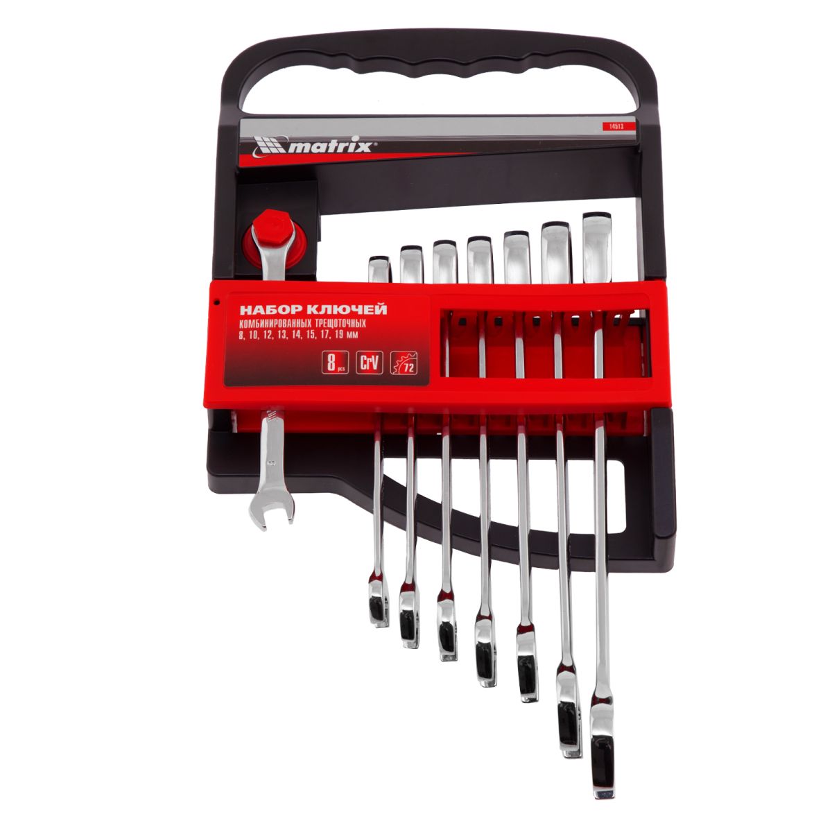 Набор из 8 комбинированных трещоточных ключей Matrix 14513 пригодится мастерам и автолюбителям для монтажа/демонтажа болтов и гаек наиболее популярных типоразмеров. Храповой механизм с 72 зубьями облегчает закручивание или откручивание крепежей, в том числе в труднодоступных местах. ПреимуществаНадежность — ключи выполнены из хромованадиевой стали повышенной прочности, твердость храпового механизма составляет 58 HRC. Защита от разрушения — хромоникелевое антикоррозионное покрытие предохраняет инструменты от воздействия влаги. Эффективная работа — 12-гранный профиль накидной части ключа плотно охватывает поверхность крепежа, предотвращая деформацию его граней. Удобство хранения и транспортировки — набор упакован в пластиковый держатель.