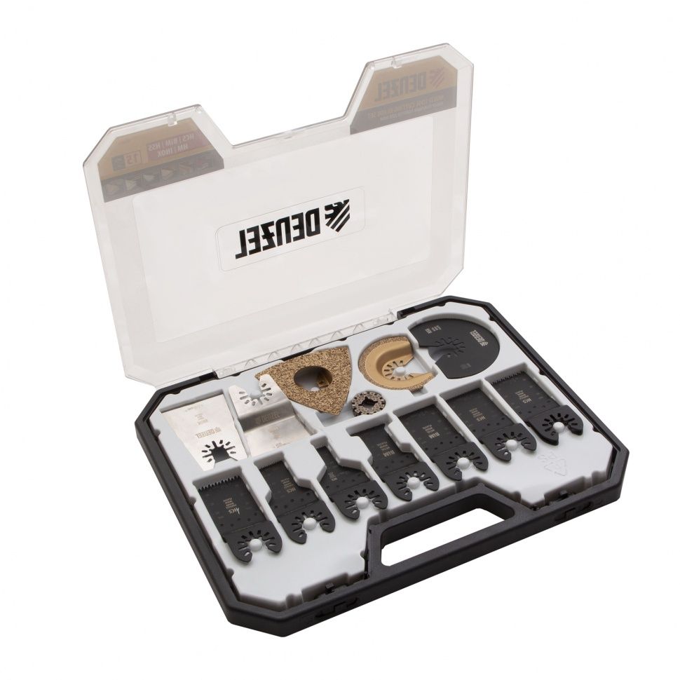 Универсальный набор Denzel 782415 включает в себя 15 насадок для МФИ, поэтому станет незаменимым помощником для частных мастеров и профессионалов. Поможет выполнить широкий спектр работ по деревянным, металлическим поверхностям, камню, плитке и пластику: шлифовку, рез, удаление герметика, выборку пазов и многое другое. ПреимуществаКомплект включает насадки из инструментальной, быстрорежущей стали и биметаллического сплава, а также насадки с твердосплавным алмазным напылением, поэтому он прослужит долго. Для повышения точности работы на насадках имеется миллиметровая рабочая шкала, благодаря которой можно контролировать глубину реза. Для удобства работы в труднодоступных местах в набор включены оснастки изогнутой формы. Среди насадок легко найти нужную, т. к. на них нанесена четкая маркировка с характеристиками. Комплектующие набора подходят для любых МФИ за счет универсальной посадки и двух переходников с шестигранным шпинделем. Набор упакован в кейс с ручкой для удобства транспортировки и хранения.