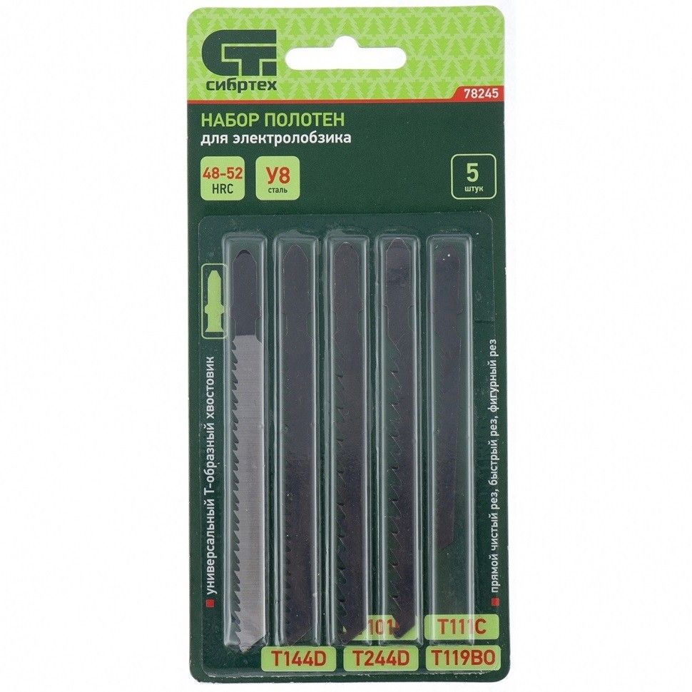 Набор полотен по дереву Сибртех 78245, 5 шт. , с универсальным Т-образным хвостовиком подходит для большинства типов электролобзиков. С его помощью можно осуществлять фигурный, прямой чистый и быстрый рез по дереву. Набор рассчитан на бытовое использование в частных мастерских, гараже, дома. ПреимуществаВысокоуглеродистая сталь У8 твердостью 48-52 HRC, из которой изготовлены полотна, гарантирует их высокий ресурс. Удобная упаковка позволяет компактно хранить полотна, а также защищает их от коррозии. Универсальный набор включает в себя полотна самых распространенных типов T101B, T111C, T144D, T244D, T119BO.