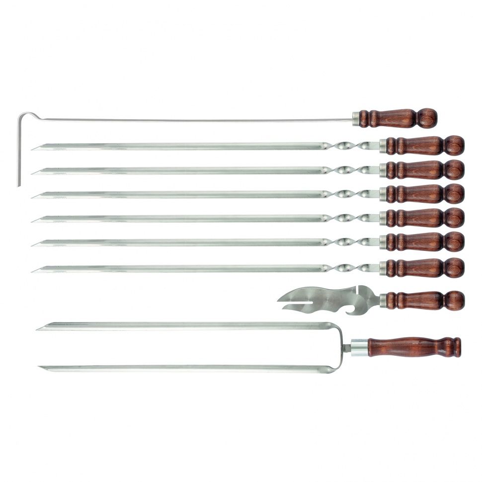 Шашлычный набор Palisad Camping 69680 включает в себя 9 предметов, упакованных в сумку. Используется для приготовления шашлыка из мяса и птицы, а также овощей. 6 плоских шампуров предназначены для нанизывания кусочков продуктов, вилка-шампур облегчает приготовление птицы или крупных кусков мяса, кочергой удобно ворошить угли, а нож позволяет быстро и аккуратно снять готовые деликатесы с шампуров. Набор пригодится в походе, на пикнике, для отдыха на даче. ПреимуществаПрочность и долговечность — элементы набора изготовлены из нержавеющей стали, шампуры увеличенной толщины не сгибаются и не деформируются под тяжестью продуктов. Надежная фиксация шампуров — благодаря винтам у основания они не прокручиваются в пазах мангала. Комфортное использование — отполированные рабочие части шампуров имеют гладкую поверхность, поэтому на них легко нанизывать мясо и овощи. Эргономичность — удобные деревянные рукоятки комфортно ложатся в руку. Безопасность — рукоятки не нагреваются в процессе приготовления пищи, что снижает риск получения ожогов. Удобное хранение и транспортировка — набор упакован в прочный чехол с ручкой.