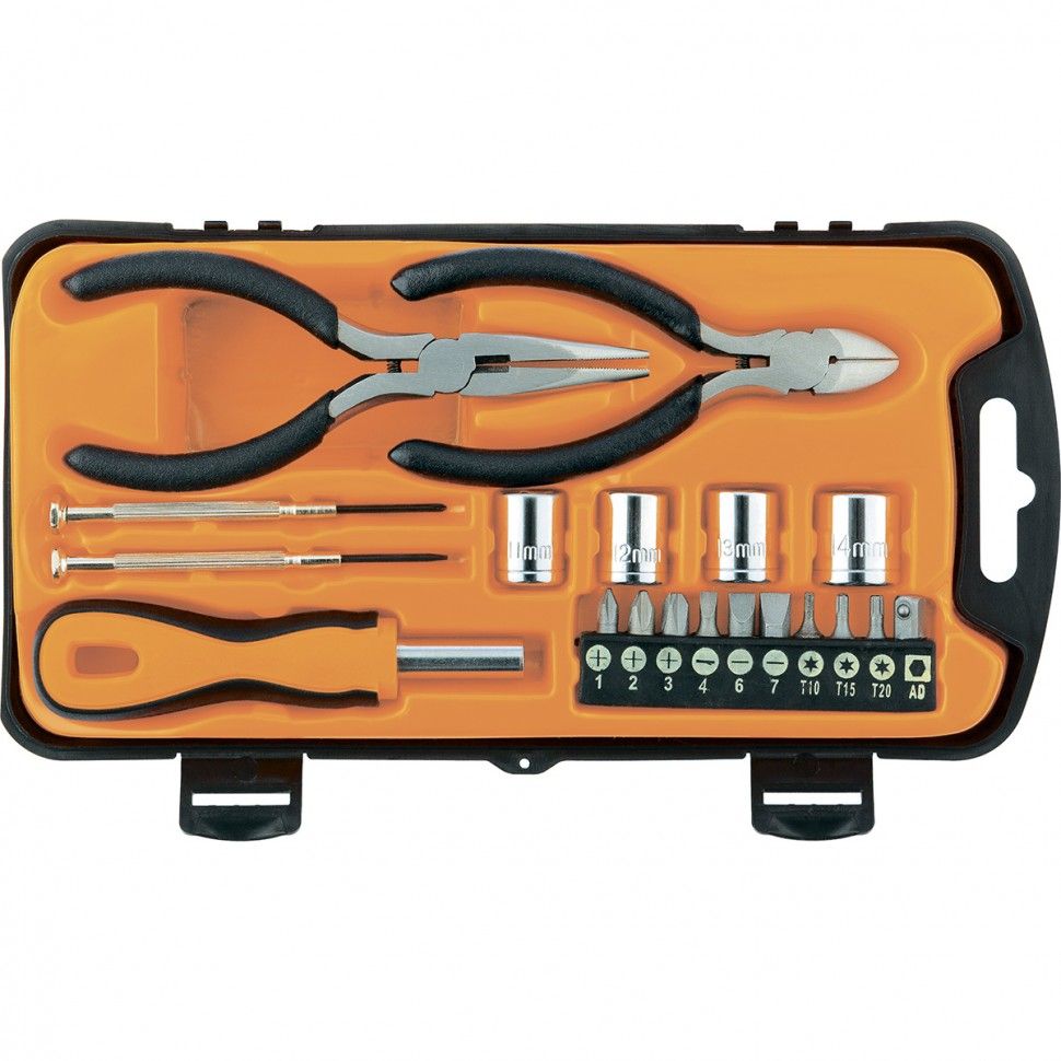Набор Sparta 13546, 19 предметов, пригодится при выполнении слесарно-монтажных работ. Он будет полезен в хозяйстве для частных мастеров. В наборе есть отвертки для точных работ, отвертка для бит, биты и торцевые головки для монтажа/демонтажа крепежных элементов, бокорезы и длинногубцы для захвата, удержания и перекусывания проводов и мелких деталей. ПреимуществаПрочность и долговечность — рабочие части деталей набора выполнены из инструментальной стали и закалены. Универсальность — в комплект входят биты и головки наиболее распространенных размеров. Удобство хранения и транспортировки — набор поставляется в пластиковом кейсе с прозрачной крышкой.