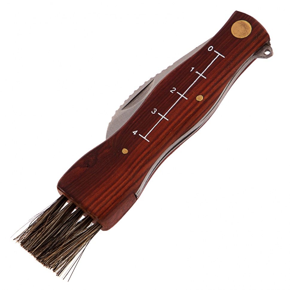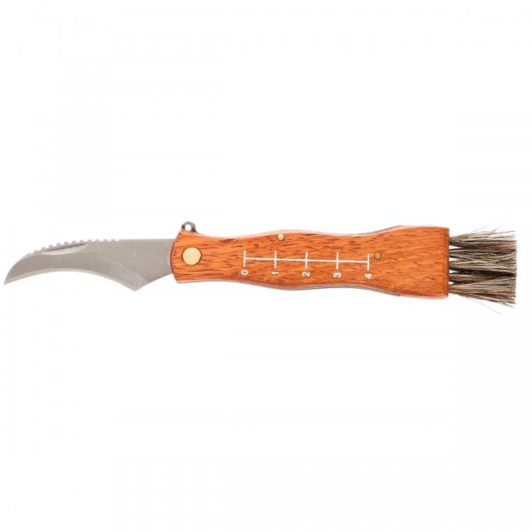 Складной нож Palisad 79004 длиной 145 мм с деревянной рукояткой пригодится грибникам для удобного сбора грибов. Складная конструкция позволяет безопасно транспортировать нож, при этом он легко поместится в карман. Лезвие серповидной формы с остро заточенной режущей кромкой легко срезает даже толстые ножки грибов. ПреимуществаДолговечность и надежность ножа достигается благодаря лезвию из нержавеющей стали, закаленной до твердости 48-50 HRC. Нож оснащен кисточкой из натуральной щетины для очищения шляпок грибов от мелких листьев, хвои и другого мусора. Специальные зазубрины на верхней кромке лезвия помогают очистить ножки грибов от земли и грязи. Выемка на лезвии позволяет легко открывать нож. Шкала на рукоятке помогает измерить длину грибов. Рукоятка из древесины пропитана маслом, защищающим ее от рассыхания и разбухания под воздействием влаги.