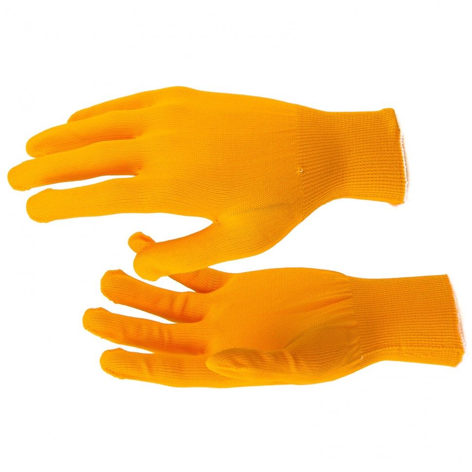 Оранжевые перчатки 67840 из нейлона, 13 класса вязки, размера XL, надежно защищают руки от мозолей, ссадин, царапин и порезов. Тонкая ткань обеспечивает высокую тактильную чувствительность пальцев, поэтому перчатки подходят для работы с мелкими предметами. Будут полезны во время строительства, ремонта, сборочных работ, пригодятся также в быту. ПреимуществаВысокий показатель прочности и износостойкости — перчатки из плотной нейлоновой пряжи устойчивы к истиранию и разрыву. Комфортная работа — материал приятен на ощупь и воздухопроницаем, поэтому руки не потеют. Удобная посадка — эластичные манжеты плотно облегают запястья, поэтому перчатки не сползают с рук. Забота о здоровье пользователя — материал перчаток гипоаллергенен.