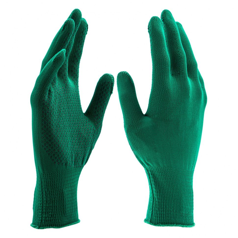Перчатки из синтетической нити 67828 с ПВХ точкой, изумрудного цвета, 13 класс вязки, размера L, применяются для защиты рук от царапин и ссадин. Они станут незаменимым помощником при осуществлении строительных, ремонтных, садовых и других работ. Плотная ткань из тонких синтетических нитей сохраняет высокую чувствительность пальцев, что особенно актуально при проведении точных работ. ПреимуществаНейлоновые нити — перчатки гипоаллергенны, обладают высокой устойчивостью к истиранию и пропускают воздух, поэтому в них удобно работать. Эластичные манжеты — перчатки надежно фиксируются на запястье и не спадают. Точечное ПВХ-покрытие — инструменты не будут выскальзывать из рук.
