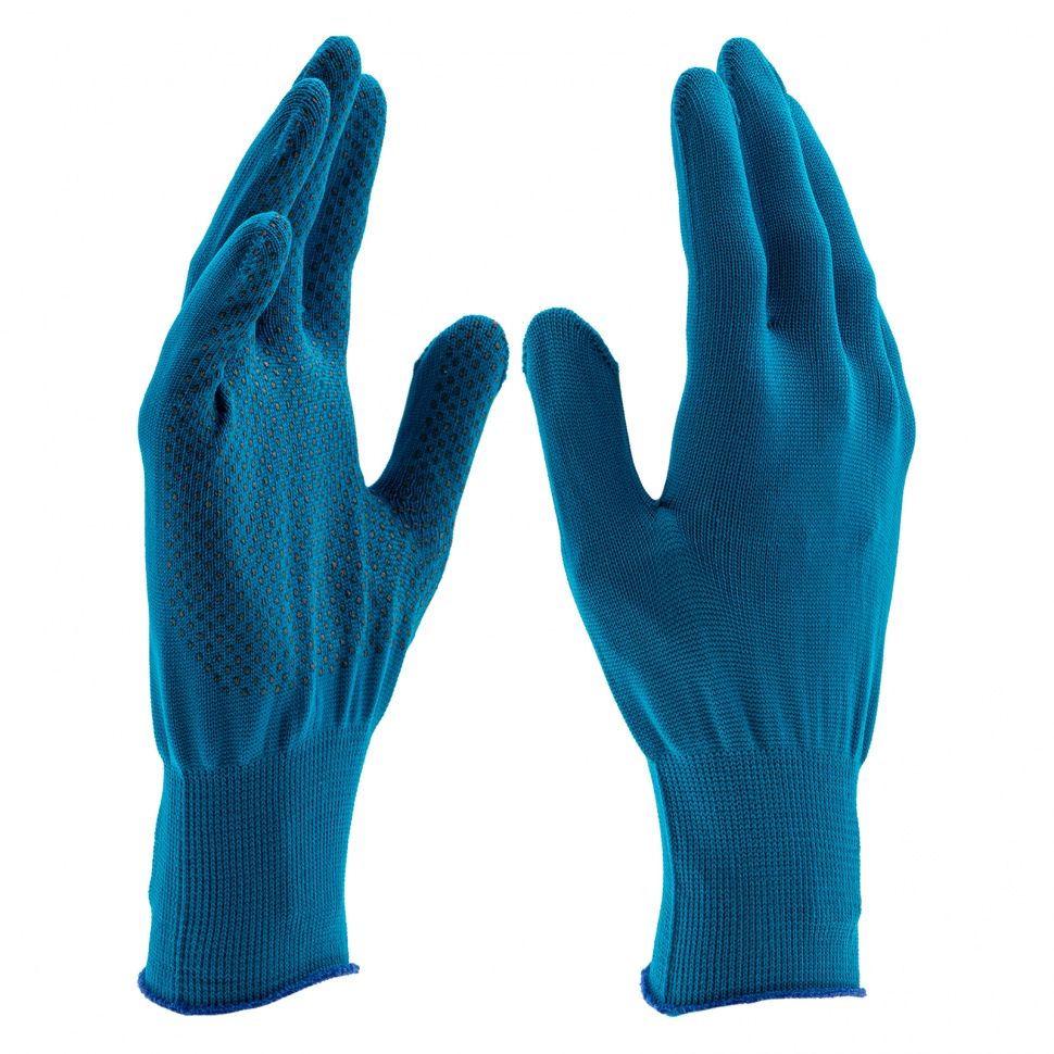 Перчатки из синтетической нити 67846 с ПВХ точкой, цвета «ультрамарин», 13 класс вязки, размера XL, применяются для защиты рук от царапин и ссадин. Они станут незаменимым помощником при осуществлении строительных, ремонтных, садовых и других работ. Плотная ткань из тонких синтетических нитей сохраняет высокую чувствительность пальцев, что особенно актуально при проведении точных работ. ПреимуществаНейлоновые нити — перчатки гипоаллергенны, обладают высокой устойчивостью к истиранию и пропускают воздух, поэтому в них удобно работать. Эластичные манжеты — перчатки надежно фиксируются на запястье и не спадают. Точечное ПВХ-покрытие — инструменты не будут выскальзывать из рук.