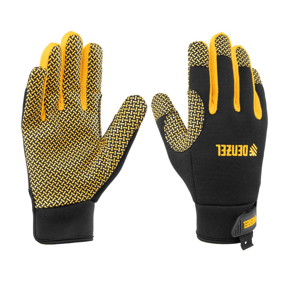 Универсальные перчатки Denzel 67999 размера 9, с силиконовым нанесением, предназначены для защиты кожи рук от механических повреждений. Используются во время слесарных и столярных работ. ПреимуществаПрочность — перчатки изготовлены из полиэстера, неопрена, полиамида и других материалов, устойчивых к разрыву и истиранию. Антискользящие свойства — силиконовое покрытие обеспечивает надежный захват инструмента. Манжеты на «липучке» — перчатки надежно фиксируются на запястьях и не сползают во время работы.