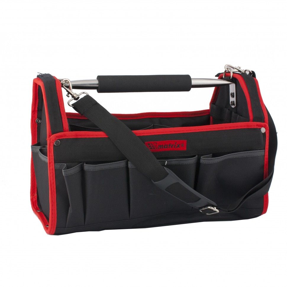 Каркасная переноска Matrix 90257 размером 415 х 230 х 260 мм удобна для перемещения и хранения инструментов. Имеет прочный каркас и весит 1,35 кг, ее легко переносить благодаря регулируемому плечевому ремню. В удобных карманах можно расположить все необходимые инструменты. Переноска пригодится дома, в гараже или в поездке. ПреимуществаПереноска прослужит долго, т. к. изготовлена из износостойкого полиэстера. Приспособление выдерживает значительный вес, поскольку имеет литое дно из полипропилена и надежно закрепленную металлическую ручку. Переноску удобно держать в руке благодаря мягкой накладке на ручке.