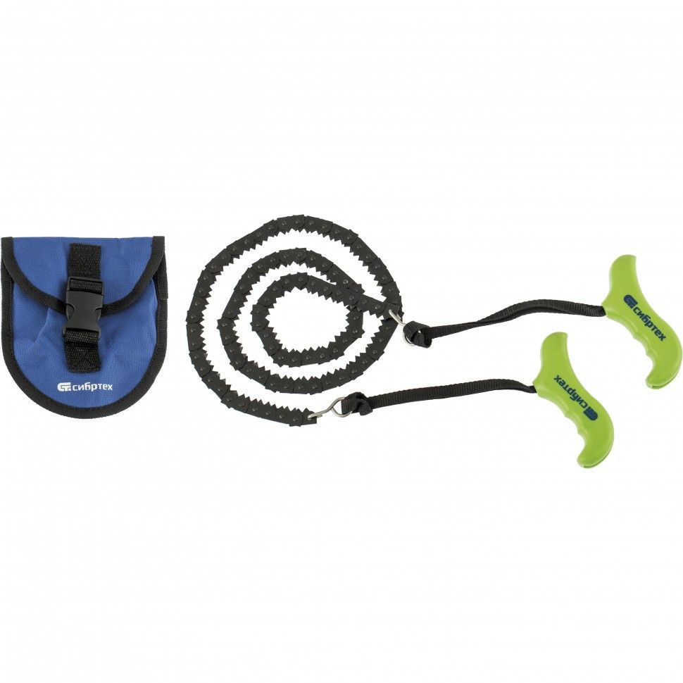 Пила ручная цепная Сибртех 23041 длиной 1000 м, с чехлом-кобурой, предназначена для поперечного распиливания древесины. Шаг зубьев составляет 5 TPI, что обеспечивает высокую скорость работы. Рукоятки надежно прикреплены к крюкам ремешками из полиэстера. Инструмент пригодится на дачном участке, в поездке, походе или на рыбалке, может использоваться для заготовки дров. ПреимуществаПрочность и упругость — пила из рессорно-пружинной стали устойчива к динамическим нагрузкам. Высокий ресурс — зубья закалены до необходимой твердости, поверхность пилы оксидирована для защиты от коррозии. Надежная конструкция — для натягивания полотна предусмотрены прочные стальные крюки. Комфортная и безопасная работа — пластиковые рукоятки с подпальцевыми выемками удобно лежат в руках и не выскальзывают из ладоней. Удобное хранение и транспортировка — сложенная пила убирается в компактный чехол-кобуру, который можно повесить на пояс.