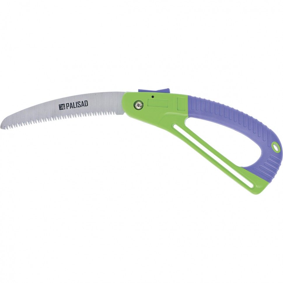 Садовая складная пила Palisad 60411 с полотном длиной 175 мм, пластиковой обрезиненной рукояткой и защитной кулисой, предназначена для продольного и поперечного распила сухой или сырой древесины. Зубья трехгранной формы с шагом 6-7 TPI облегчают работу и обеспечивают чистый и ровный рез. Складная пила удобна и безопасна в транспортировке и хранении, что делает ее оптимальной для использования на выездных работах и в походах. ПреимуществаПрочность и долговечность — полотно изготовлено из упругой рессорно-пружинной стали. Высокий ресурс — зубья закалены до необходимой твердости и остро заточены. Эффективная работа — полотно с разведенными зубьями не застревает в древесине. Безопасность пользователя — защитная кулиса на рукоятке предохраняет руку от травмирования во время работы в густых зарослях. Надежная конструкция — кнопочный фиксатор удерживает полотно в рабочем или сложенном положении. Комфортная работа — двухкомпонентная эргономичная рукоятка с обрезиненным покрытием надежно ложится в руку.