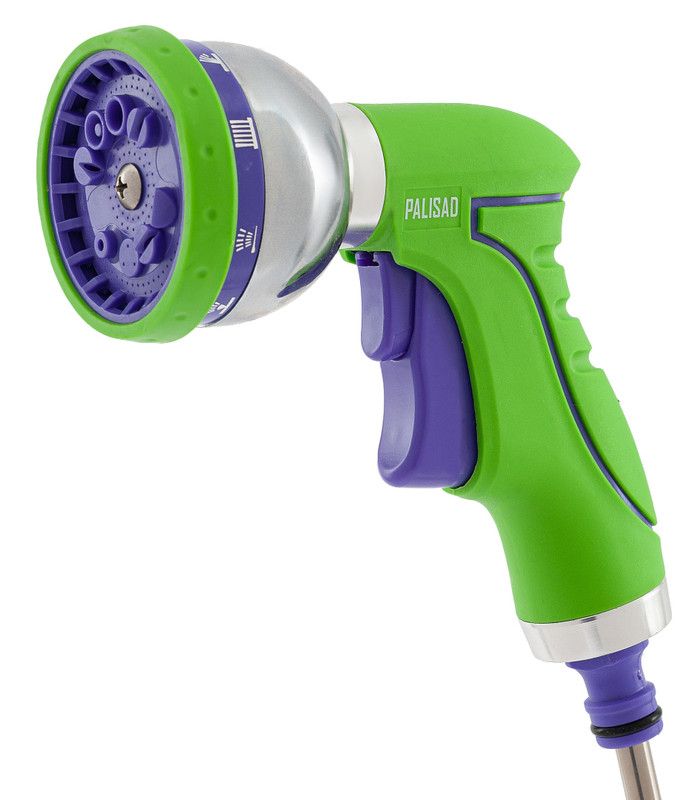 Пистолет-распылитель Palisad 652635 c 9 режимами работы облегчает поливочные работы. Благодаря ему можно очистить садовые дорожки, промыть инвентарь, оросить клумбы и грядки и т. д. Пригодится владельцам загородных домов для ухода за садом и огородом, а также работникам коммунальных служб для работы в скверах, на придомовых территориях. Универсальный штуцер на пистолете подходит для любых систем полива ТМ Palisad и Palisad Luxe. ПреимуществаПрочная и долговечная конструкция — корпус выполнен из стали, высококачественного ABS-пластика и резины. 9 типов распыления воды: центральное, конусное, под углом, концентрированный душ, туман, а также мощная, плоско-вертикальная, концентрированная, концентрированная тонкая и плоско-горизонтальная струя. Регулировка струи — плавающий курок с 5-ступенчатым фиксатором позволяет настраивать силу напора и осуществлять непрерывный полив. Простое управление — для начала работы достаточно нажать на курок, расположенный спереди.