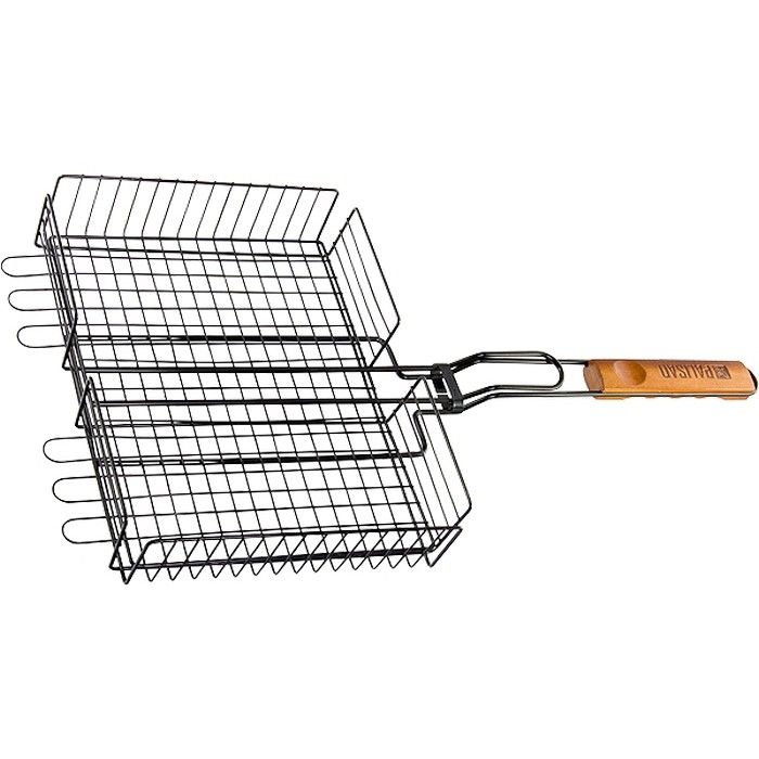 Объемная решетка гриль Palisad Camping 69552 размером 260 х 320 х 65 мм, с антипригарным покрытием, повышает удобство приготовления еды в мангале. Благодаря объемной конструкции решетку можно регулировать по высоте для качественного приготовления крупных кусков рыбы, мяса и даже целой тушки курицы без вытекания сока. ПреимуществаНадежность и высокий ресурс — решетка выполнена из жаропрочной стали высокого качества. Антипригарное покрытие — продукты не прилипают к решетке. Толстое кольцо-фиксатор — во время переворачивания решетки содержимое не выпадает. Увеличенные опорные стержни — в ходе готовки рабочая площадь решетки используется полностью. Комфортное использование — деревянная эргономичная рукоятка удобно лежит в руке.