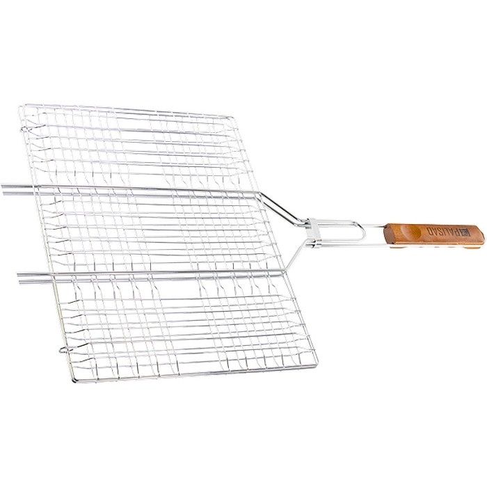 Хромированная решетка гриль Palisad Camping 69558 размером 300 х 400 мм предоставляет возможность приготовления на углях продуктов, которые трудно наколоть на шампур. Она будет полезна любителям отдыха на открытом воздухе для жарки стейков, рыбы, овощей и т. д. ПреимуществаГарантией качества и долговечности решетки выступает жаропрочная сталь, из которой она выполнена. Хромированная решетка устойчива к коррозии, поэтому на ней не образуется ржавчина. Благодаря широкому кольцу-фиксатору части решетки не раскрываются в процессе эксплуатации, поэтому еда не выпадет. Деревянная рукоятка оснащена подпальцевыми выемками для удобного захвата. Решетка оборудована увеличенными опорными стержнями, за счет чего прочно фиксируется на мангале, а при готовке ее площадь используется полностью.