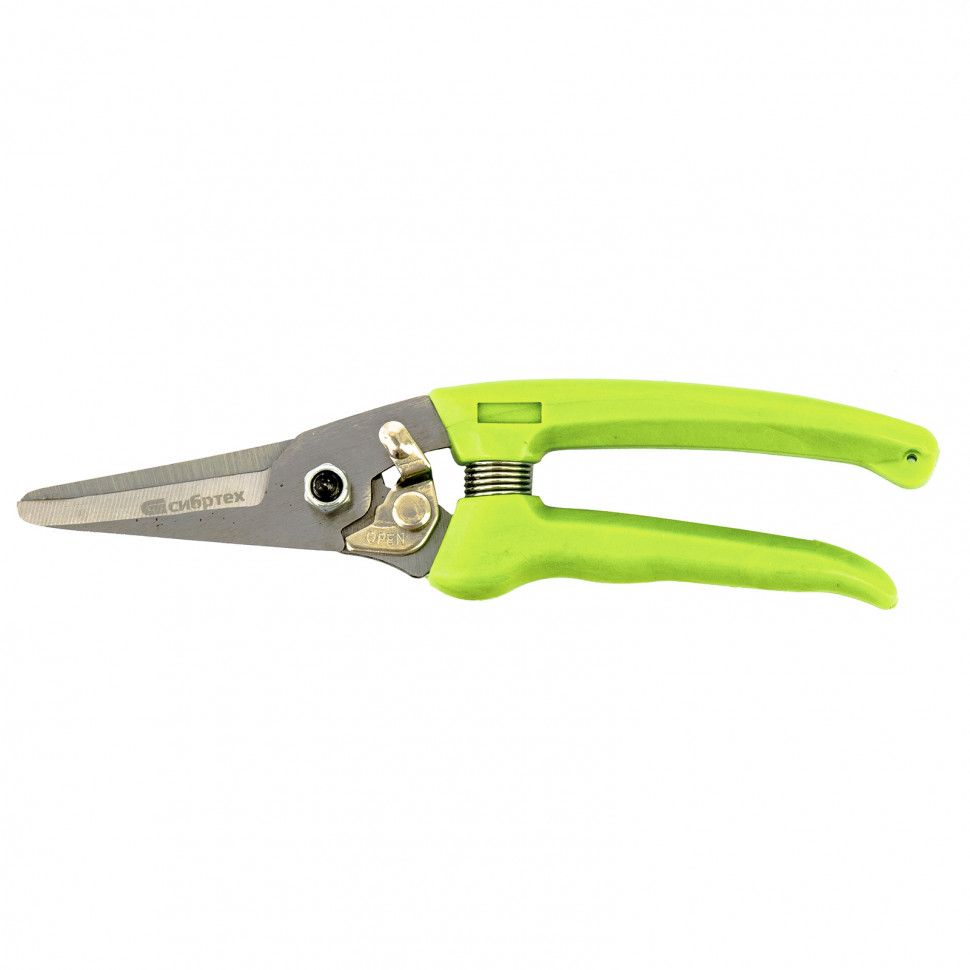 Цветочный секатор Сибртех 60494 длиной 205 мм, с пластиковыми рукоятками, — садовый инвентарь для обрезки молодых побегов и стеблей толщиной до 10 мм. Используется для ухода за растениями на даче, в саду и огороде, пригодится также в домашнем хозяйстве для разрезания картона, бумаги, ткани, подвязочного материала. Лезвия, движущиеся в параллельных плоскостях, производят чистый и ровный срез. Плотность смыкания лезвий можно изменить при помощи регулировочного винта. ПреимуществаНадежность — лезвия изготовлены из среднеуглеродистой стали, поэтому инструмент подходит для регулярного использования. Высокий ресурс — благодаря индукционной закалке и прецизионной заточке режущие кромки долго сохраняют остроту. Защита от разрушения — рабочие части покрыты антикоррозионным маслом, рукоятки из полипропилена устойчивы к воздействию ультрафиолета,Удобное хранение и транспортировка — надежный фиксатор лезвий препятствует их самопроизвольному раскрытию.