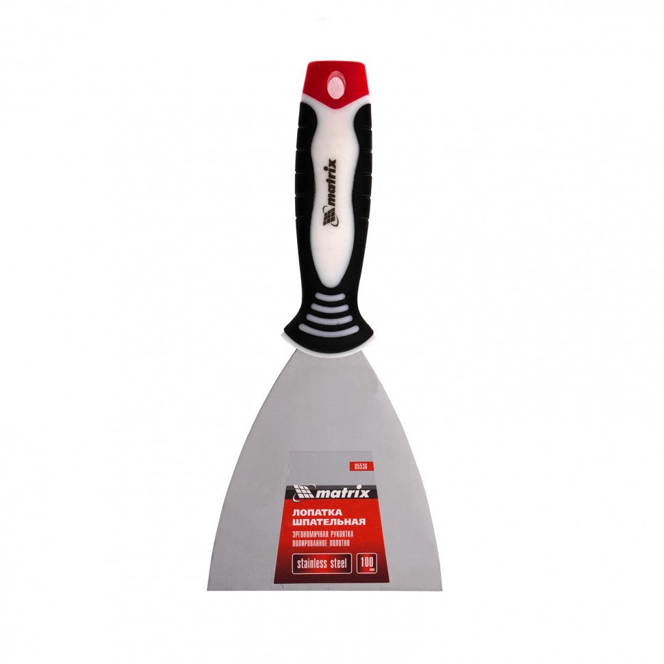 Шпательная лопатка Matrix 85536 из нержавеющей стали, с полотном шириной 100 мм и 3-компонентной ручкой, подходит для бытового и профессионального применения. Инструмент позволяет замешивать, наносить и разравнивать штукатурку и другие строительные растворы, заполнять швы, заделывать трещины и выполнять иные отделочные работы. ПреимуществаПовышенная упругость и износостойкость — рабочая часть изготовлена из профилированной нержавеющей стали по новейшим технологиям. Эффективная работа — за счет зеркальной полировки с полотна легко удаляются остатки смеси. Гибкость и прочность — рабочее полотно прошло термическую обработку для повышения эксплуатационных качеств. Эргономичность — рукоятка анатомической формы имеет нескользящее покрытие для удобного захвата и комфортной работы. Ширина 10 см — небольшая лопатка оптимально подходит для исправления мелких неровностей и трещин в труднодоступных местах. Долговечность — рабочее полотно прочно соединено с рукояткой. Удобное подвесное хранение — в рукоятке предусмотрено отверстие.