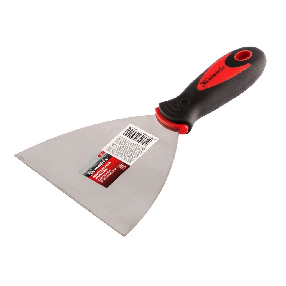 Шпательная лопатка из нержавеющей стали Matrix 85512 шириной 120 мм, с двухкомпонентной рукояткой, предназначена для нанесения разравнивания и сглаживания строительных смесей, шпаклевания швов, заполнения трещин, удаления старых обоев. За счет компактных размеров инструмент подходит для корректировки мелких трещин и неровностей. ПреимуществаВысокий ресурс — профилированное полотно изготовлено из нержавеющей стали, отполировано и надежно соединено с рукояткой. Гибкость в сочетании с прочностью — термически обработанное рабочее полотно отличается высокой твердостью. Эргономичность — рукоятка анатомической формы с нескользящим покрытием обеспечивает надежный захват инструмента и комфортную работу. Отверстие для удобного хранения — лопатку можно вешать на крючок или гвоздь.