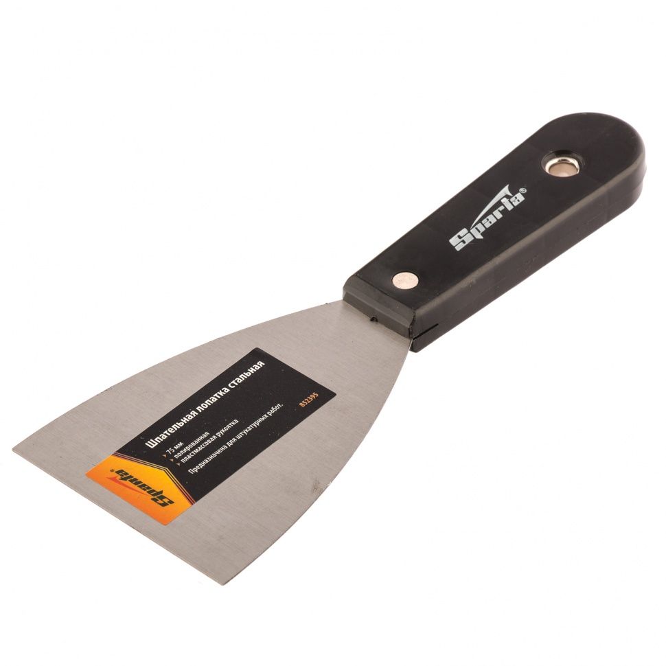 Стальная шпательная лопатка Sparta 852395 шириной 75 мм, полированная, с пластмассовой ручкой, станет незаменимым помощником при проведении строительных и ремонтных работ. Пригодится мастерам для нанесения, выравнивания и сглаживания различных клеевых и строительных растворов. ПреимуществаОдна лопатка для разных задач — за счет острого края полотном удобно удалять с поверхностей следы ржавчины. Коррозионная стойкость — рабочая часть покрыта защитным бесцветным лаком. Прочность и долговечность — полотно выполнено из углеродистой стали и надежно скреплено с рукояткой. Качественная работа — полотно отполировано, поэтому к нему не прилипает раствор, а обрабатываемая поверхность получается идеально гладкой. Небольшая ширина 7,5 см — шпателем удобно работать в труднодоступных местах. Комфортная работа — легкая пластиковая рукоятка удобно ложится в руку. Практичное хранение — в рукоятке имеется отверстие для подвешивания.