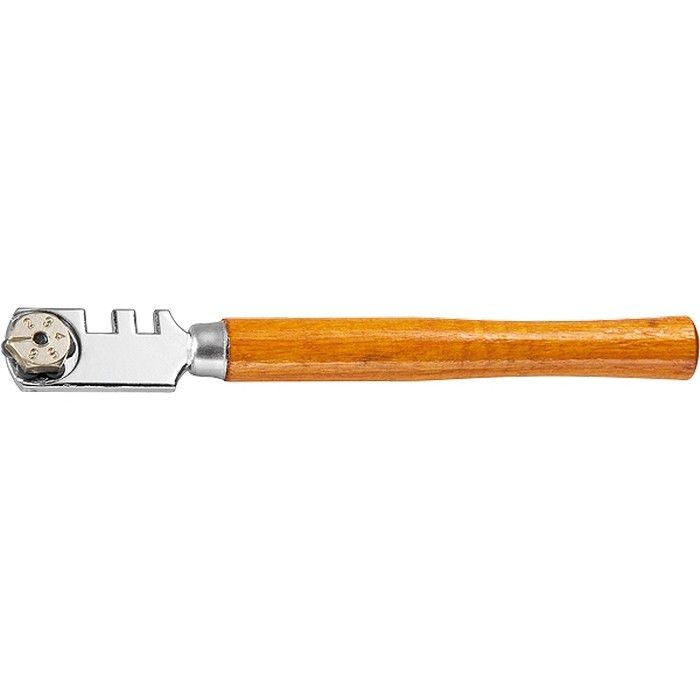 Шестироликовый стеклорез Sparta 872205 с деревянной рукояткой служит для резки стекла толщиной до 6 мм и подходит для бытового использования. С его помощью можно изготовить столешницу, полочку, заменить стекло в аквариуме или двери. Блок с 6 роликами позволяет быстро установить новый режущий элемент взамен изношенного — достаточно ослабить винт и повернуть головку. На головке имеются пазы шириной 4 и 5 мм для отламывания кромки стекла, увеличивающие функциональность стеклореза. ПреимуществаИзносостойкость — ролики из твердого сплава ВК8 долго сохраняют режущую способность. Надежность — металлическая головка устойчива к слому, рукоятка покрыта лаком для защиты от рассыхания. Комфортная работа без лишних усилий — рабочий элемент легко движется по поверхности стекла. Эргономичность — деревянная рукоятка удобно ложится в руку.