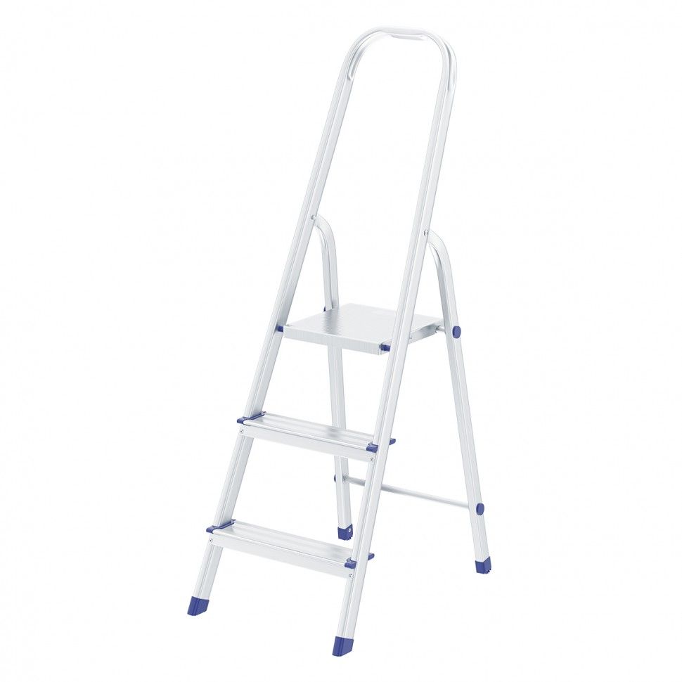 Стремянка алюминиевая Сибртех 97713 с 3 ступенями предназначена для выполнения работ на высоте, превышающей человеческий рост. Высокая дуга безопасности обеспечивает устойчивое положение пользователя. Площадка находится на высоте 59,7 см от опорной поверхности, рабочая высота стремянки составляет 259,7 см (при среднем росте пользователя 170 см). Стремянка пригодится во время строительных и ремонтных работ, позволит без лишних усилий повесить картину или шторы, покрасить стену, достать нужную вещь с антресолей или верхней полки шкафа, а также решить много других бытовых задач. Стремянка устанавливается на плоскую поверхность и не предназначена для работы с электроинструментом. ПреимуществаПродуманная конструкция — стальная рабочая площадка с зацепами надежно фиксирует стремянку в разложенном положении. Надежность — рама из прямоугольного алюминиевого профиля выдерживает нагрузку до 150 кг, широкие ступени закреплены заклепками. Безопасность пользователя — рифленая поверхность ступеней предотвращает скольжение, пластиковые накладки на углах снижают риск травмирования. Защита опорной поверхности от царапин — на ножках имеются пластиковые заглушки. Вес 2,7 кг — со стремянкой без труда справится пользователь с любым уровнем подготовки. Компактность — габариты стремянки в сложенном состоянии составляют 1313 х 416 х 112 мм, поэтому ее удобно хранить и транспортировать. Внешний вид товара может незначительно отличаться от указанного на изображении, что не влечет изменения его качества.