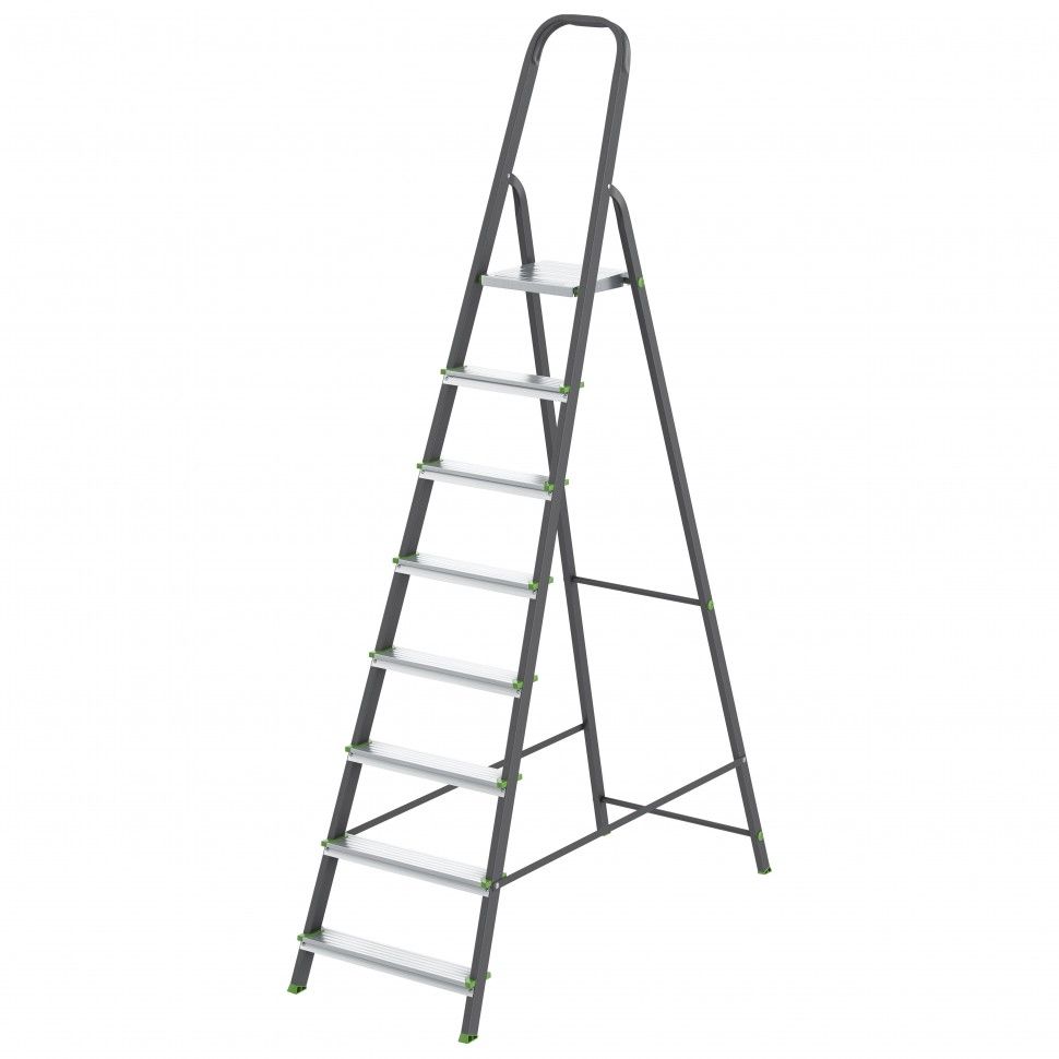 Стремянка Сибртех 97958 со стальным профилем и 8 ступенями, 7 из которых алюминиевые, упрощает доступ к предметам, расположенным на антресолях, шкафах, высоких полках. Также будет полезна для проведения отделочных и монтажных работ. Лестница обладает высокой прочностью при весе 8,5 кг и выдерживает нагрузку до 150 кг. Площадка находится на высоте 166,6 см от опорной поверхности, рабочая высота стремянки составляет 366,6 см (при среднем росте пользователя 170 см). Стремянку следует устанавливать на ровную поверхность, работать на ней с электроинструментом нельзя. ПреимуществаНадежность — рама изготовлена из профилированной стали, стальная верхняя площадка с зацепами прочно фиксирует стремянку в рабочем положении, страховочные ленты придают дополнительную прочность конструкции. Долговечность — покрытие из порошковой эмали антрацитового цвета защищает стальную поверхность от коррозии. Безопасность пользователя — на всех ступенях имеется рифление, пластиковые накладки по краям защищают от травм. Защита напольного покрытия — опоры с пластиковыми рифлеными наконечниками не скользят и не оставляют царапин. Комфортная работа — стремянка имеет широкие ступени и высокую дугу безопасности. Удобное хранение и транспортировка — размеры лестницы в сложенном состоянии 2410 х 530 х 112 мм. Внешний вид товара может незначительно отличаться от указанного на изображении, что не влечет изменения его качества.