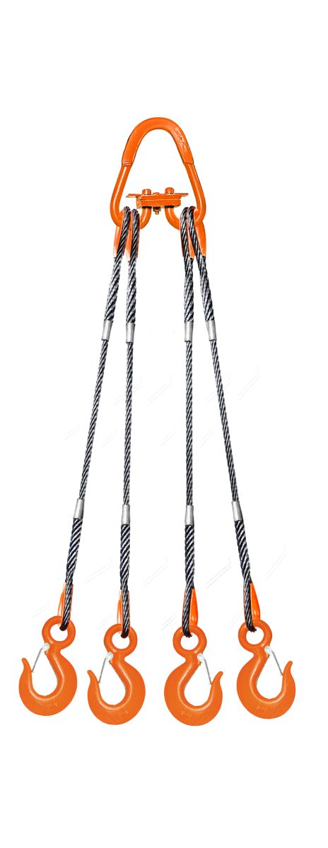 онструкция четырехветвевого канатного стропа 4СК состоит из разборного звена типа Рт и четырех канатных ветвей типа ВК, с чалочным крюком Кч1 на одном конце ветви и петлей с коушем на другом. Вместо крюка может также быть использован грузоподъемный захват или такелажная скоба. Строп четырехветвевой это популярное изделие, на профессиональном жаргоне иногда его называют "паук". Производится согласно РД-10-33-93 и ГОСТ 25573-82.