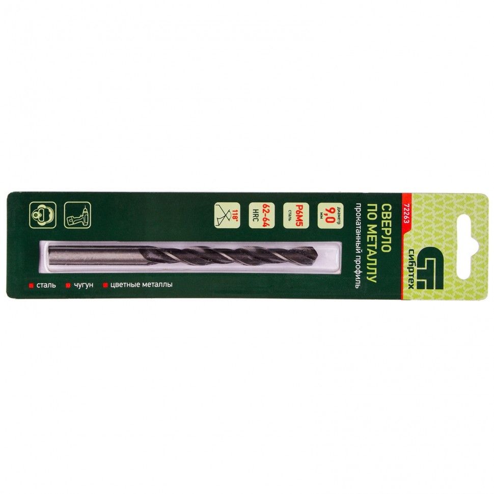 Сверло по металлу Сибртех 72263 диаметром 9,0 мм, имеет угол заточки 118°, оптимальный для получения отверстий в черных и тяжелых металлах, в том числе стали, чугуне и твердой бронзе. Отличается наиболее выгодной стоимостью по сравнению с другими моделями из стали P6M5. Используется для выполнения монтажно-сборочных работ, будет полезно в быту. ПреимуществаНадежность — сверло из быстрорежущей стали, легированной вольфрамом и молибденом, устойчиво к динамическим нагрузкам и перегреву. Высокий ресурс — режущие кромки твердостью 62-64 HRC долго держат заточку. Эффективная работа — благодаря полированной поверхности уменьшается трение сверла о стенки отверстия и улучшается отведение стружки. Универсальность — цилиндрический хвостовик подходит ко всем типам патронов.