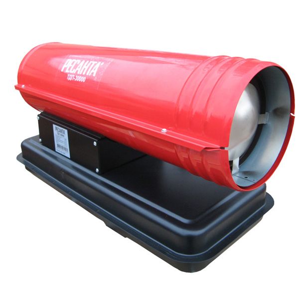 Модель тепловой пушки, которая ниже будет рассматриваться более подробно, относится к классу дизельных тепловых пушек. Это говорит о том, что в качестве топлива используется солярка. Итак, вашему вниманию представляется дизельная тепловая пушка прямого нагрева Ресанта ТДП-30000. Сразу необходимо сказать о пушках прямого и непрямого нагрева, в чем их отличие. Ведь это очень важная особенность, которая сыграет важную роль в возможности применения пушки в том или ином месте. А отличие их в том, куда отводятся продукты сгорания дизельного топлива: в пушках прямого нагрева они выводятся совместно с нагретым воздухом в помещение, в пушках непрямого нагрева – выводятся отдельно, не загрязняя воздух обогреваемого помещения. Несомненно, многие скажут, что тепловые пушки непрямого нагрева гораздо лучше. Это бесспорно, если говорить о большей возможности выбора мест, где их можно использовать. При этом другая часть людей возразит и тоже будет права, сказав, что лучше тепловые пушки прямого нагрева, ведь они выигрывают в мощности и продуктивности. Вот мы и подошли к вопросу, который должен многое расставить на свои места, а именно, где планируется применение тепловой пушки.