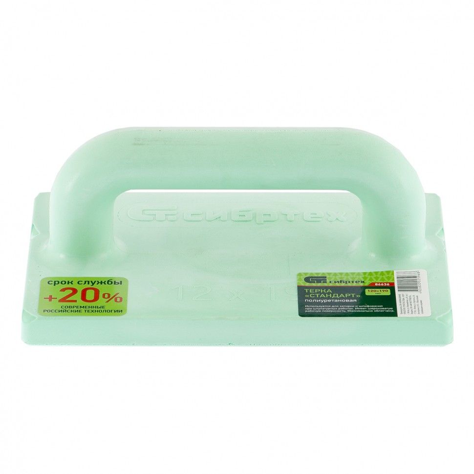 Облегченная полиуретановая терка Сибртех 86636 размером 120 х 190 мм предназначена для затирки и шлифования оштукатуренной поверхности во время отделочных работ. Успешно справляется со своей задачей благодаря шероховатой подошве. Компактная терка удобна для обработки небольших участков. Инструмент используется в профессиональной сфере, подойдет также для выполнения самостоятельного ремонта помещения. ПреимуществаИзносостойкость — терка изготовлена из полиуретана, устойчивого к истиранию. Долговечность — полиуретан не впитывает влагу и не рассыхается, не гниет, не ржавеет и не разрушается от перепадов температур и контактов с химическими веществам. Комфортная работа — инструмент весит всего 96 г, эргономичная рукоятка круглого сечения удобно ложится в руку.
