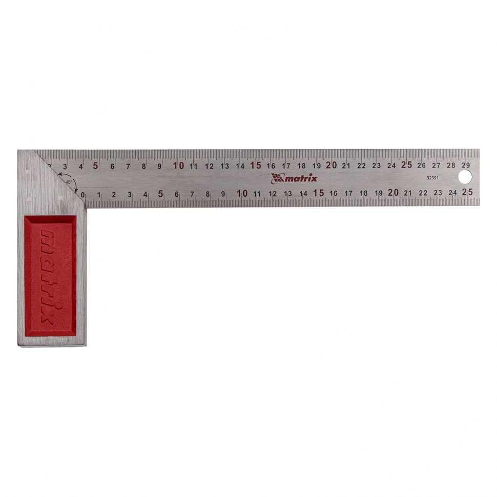 Стальной угольник Matrix 32391 длиной 300 мм, с градуировкой, — измерительный инструмент для построения и контроля углов. Будет полезен для проведения столярных и строительных работ. ПреимуществаПрочность — угольник изготовлен из стали. Защита от коррозии — основание инструмента окрашено. Удобная эксплуатация — измерительная шкала нанесена на обе стороны полотна. Возможность подвесного хранения — в корпусе имеется специальное отверстие.