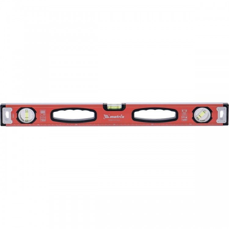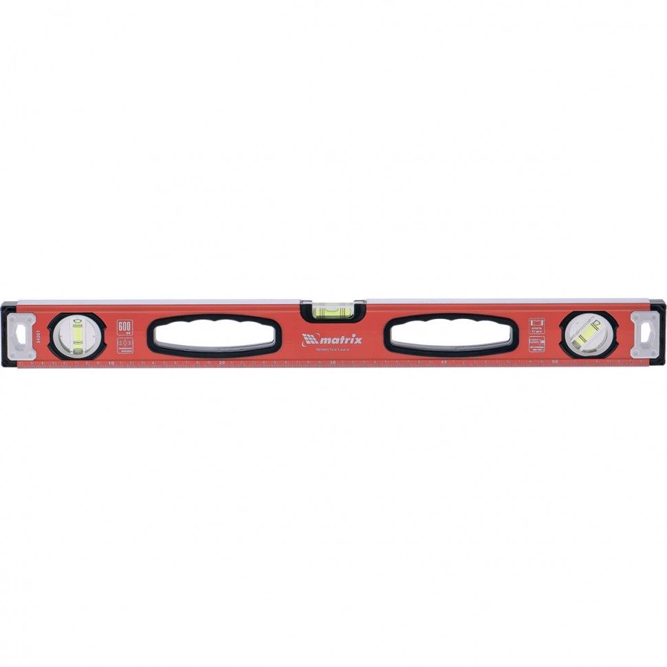 Алюминиевый фрезерованный уровень Matrix 34203 длиной 1000 мм, с 3 глазками и рукоятками, позволяет обнаружить отклонения от вертикали и горизонтали, а также выставить диагональ. Инструмент будет полезен на строительной площадке, при выполнении ремонтных и монтажных работ. ПреимуществаНадежность — уровень изготовлен из алюминиевого профиля, колбы установлены с использованием электронной калибровки. Высокая точность выполняемых работ — рабочая поверхность фрезерована для снижения погрешности измерений. Эргономичность — благодаря отверстиям в корпусе инструмент удобно удерживать. Использование в качестве линейки — на корпус нанесена измерительная шкала. Для определения отклонения вертикали 90° необходимо использовать пузырьковую ампулу только в верхнем положении уровня. Только базовая поверхность (противоположная ампуле 180°) является рабочей.