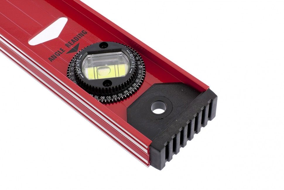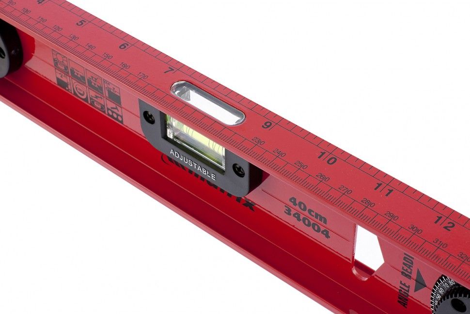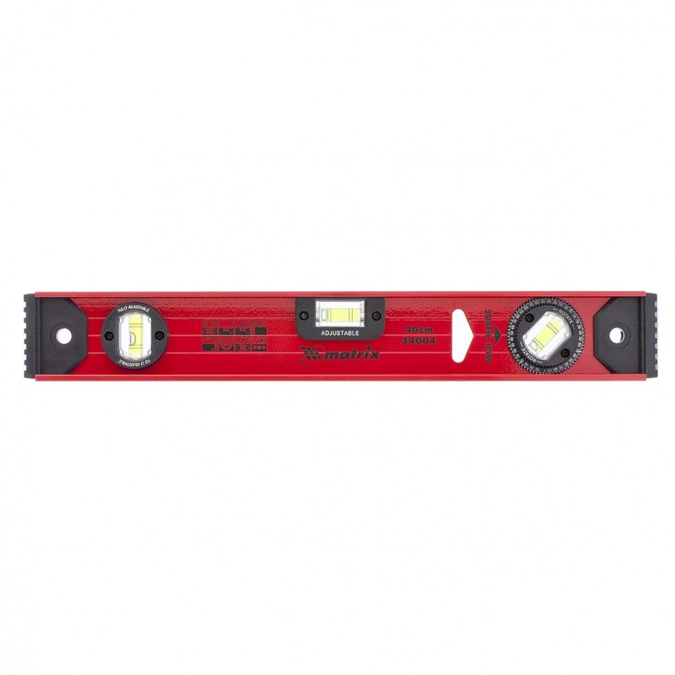 Уровень алюминиевый усиленный Matrix «Рельс» 34004 длиной 400 мм снабжен 3 глазками для проверки отклонений относительно горизонтальной и вертикальной плоскостей. Поворотный глазок уровня позволяет выстроить произвольный угол. Инструмент пригодится строителю, отделочнику, бетонщику и другим специалистам. ПреимуществаКонструкционная прочность — инструмент из двутаврового алюминиевого профиля устойчив к механическим воздействиям. Удобное проведение сантехнических работ — подошва V-образной формы позволяет закрепить уровень на трубе. Высокая точность — инструмент имеет фрезерованную подошву, погрешность составляет 1 мм/м (0,057°). Для определения отклонения вертикали 90° необходимо использовать пузырьковую ампулу только в верхнем положении уровня. Только базовая поверхность (противоположная ампуле 180°) является рабочей.