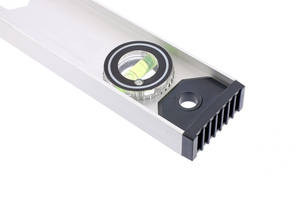 Уровень алюминиевый Sparta «Рельс» 34048 длиной 800 мм имеет 3 глазка, 1 из которых поворотный. С помощью инструмента удобно определять наличие отклонений от горизонтали и вертикали, а также выставлять произвольный угол. ПреимуществаПрочность — корпус выполнен из двутаврового алюминиевого профиля. Защита корпуса — торцевые заглушки повышают ударопрочность и предотвращают попадание внутрь пыли и мелкого мусора. Удобный захват — в корпусе имеется 2 отверстия. Точные результаты — погрешность составляет всего 1 мм/м (0,057°). Дополнительные возможности — измерительная шкала позволяет использовать уровень в качестве линейки. Для определения отклонения вертикали 90° необходимо использовать пузырьковую ампулу только в верхнем положении уровня. Только базовая поверхность (противоположная ампуле 180°) является рабочей.